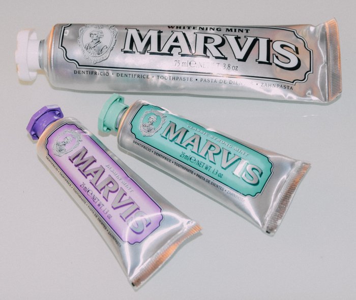 Es gibt unzählige Whithening-Zahnpasten auf dem Markt. Wir werden richtig überrannt. Ganz wichtig ist hier der RDA- Wert zu beachten. Ist dieser über 100 schädigt er unseren Zahnschmelz. Je höher der RDA-Wert, desto abrasiver (abtragender, angreifender, schädlicher) ist die Zahnpasta. Doch weiss werden die Beisserchen dabei schon! Die Zahnstruktur wird aufgeraut und dabei bilden sich mehr Ablagerungen und die Zähne werden empfindlicher. Auch die Häufigkeit und Dauer des Putzens spielen eine Rolle. Ich empfehle daher nie eine Whithening-Zahnpasta konstant zu benutzen, sondern immer etwas abzuwechseln. Eine der bekanntesten Whithening-Zahnpasten ist die Pearl Weiss und die Colgate Sensation White. Leider liegen Ihre RDA-Werte über 100. Ich empfehle MARVIS Whitening Mint. Seit über 40-Jahren ist sie der Klassiker schlechthin. Sie überzeugt nicht nur mit ihren starken langanhalten Minz Geschmack, der am Morgen gleich aufweckt, sondern auch mit Ihrem Retrolook.