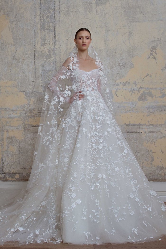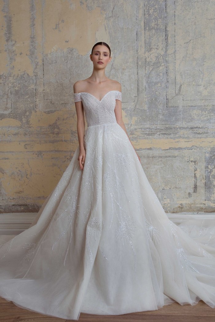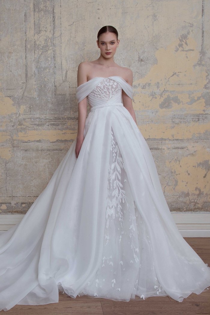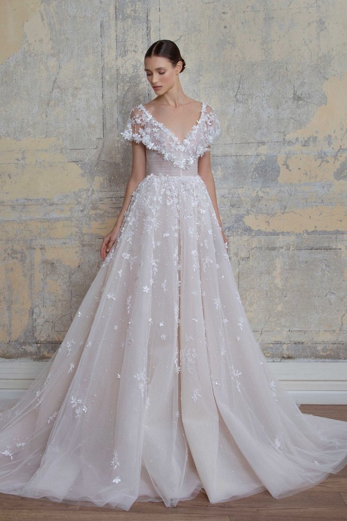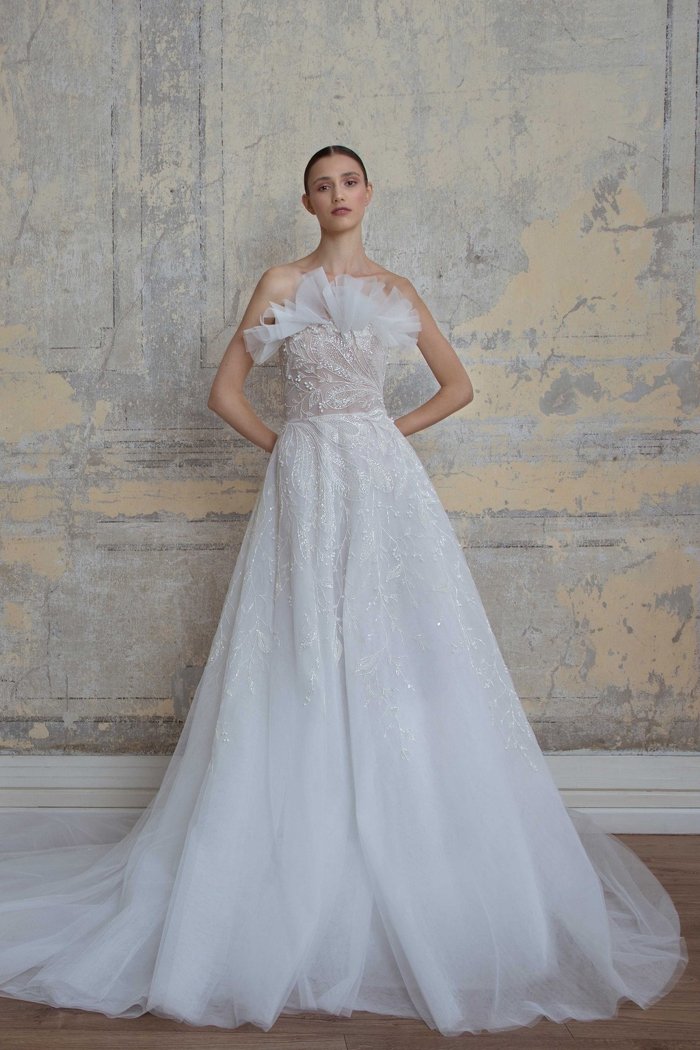 Die Maison Georges Hobeika Brautkollektion 2020 setzt auf eine klassische Linie. A-Linie und fast alle Modelle mit Hauptaugenmerk auf das Décolleté und das Schlüsselbein. Schulterfreie Kleider oder mit schmeichelnden Schmetterlingsflügeln.