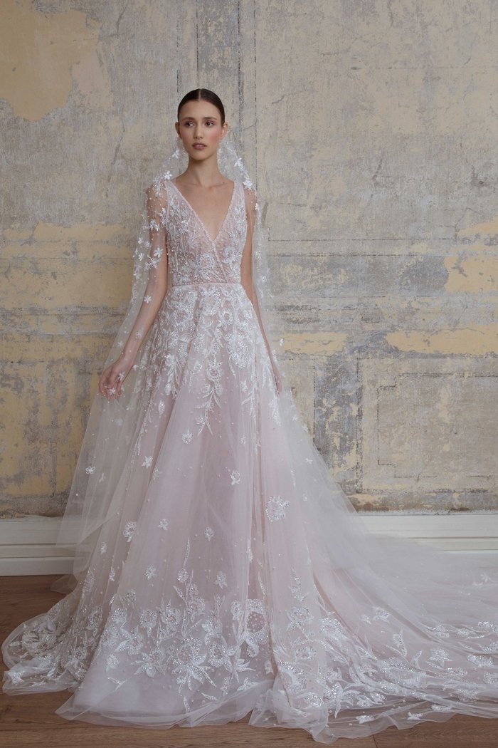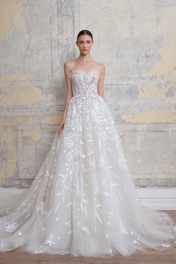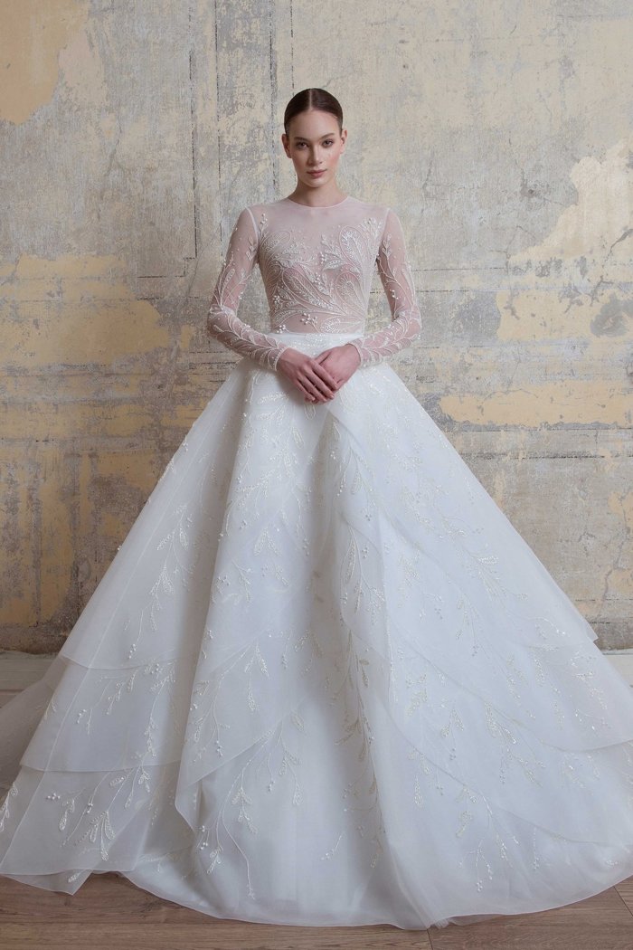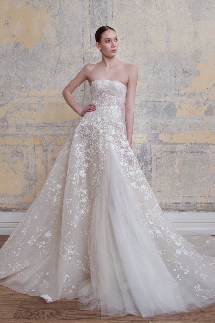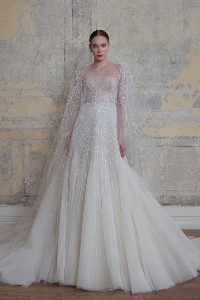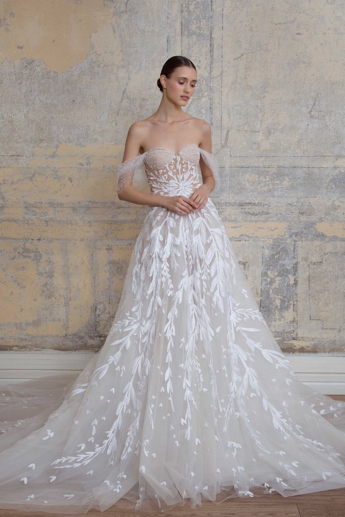 Die Maison Georges Hobeika Brautkollektion 2020 setzt auf eine klassische Linie. A-Linie und fast alle Modelle mit Hauptaugenmerk auf das Décolleté und das Schlüsselbein. Schulterfreie Kleider oder mit schmeichelnden Schmetterlingsflügeln.