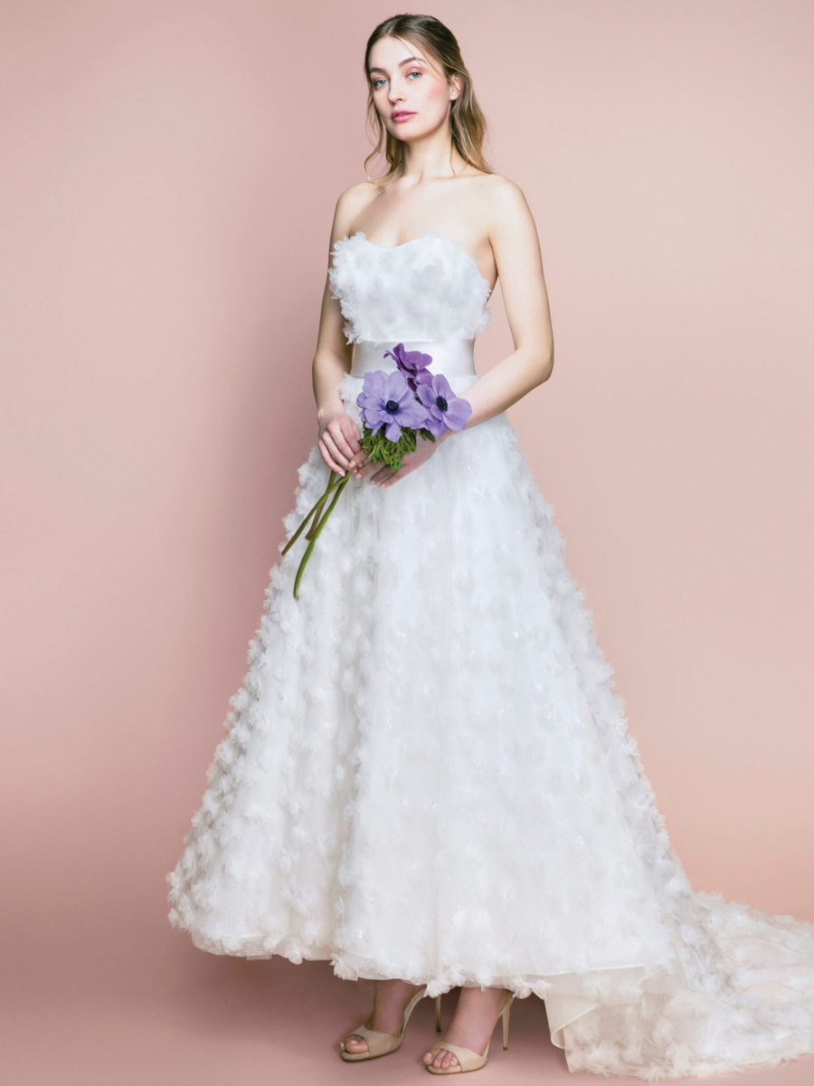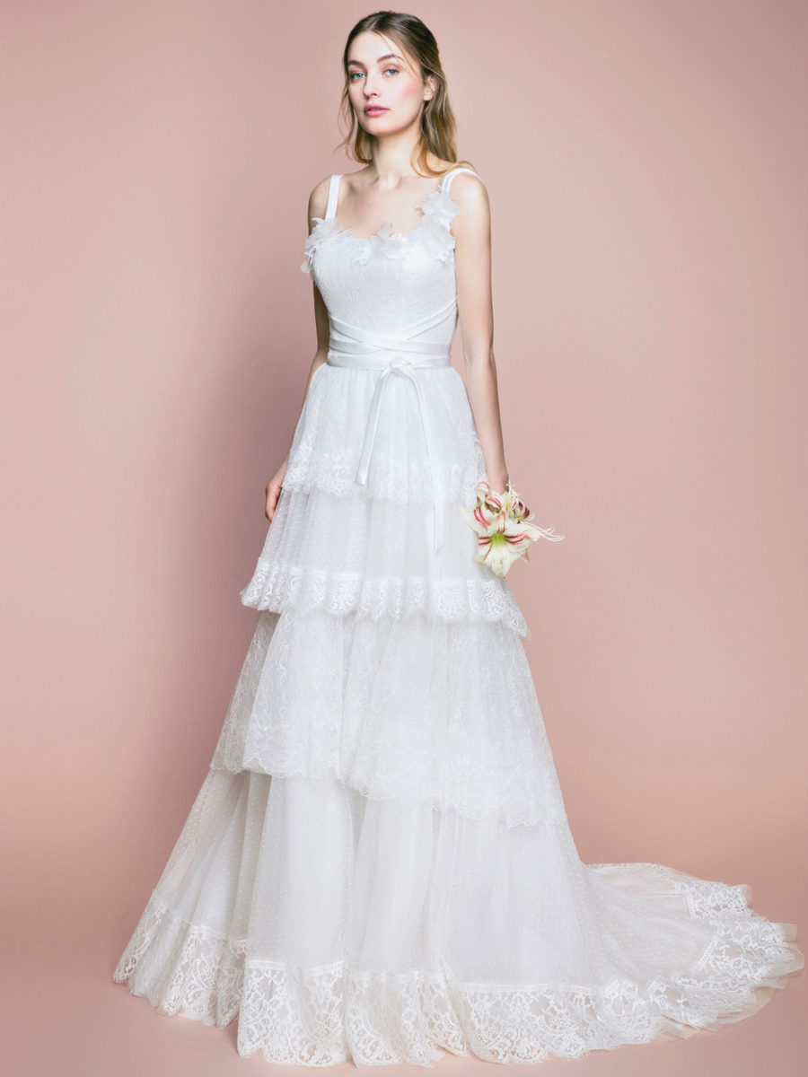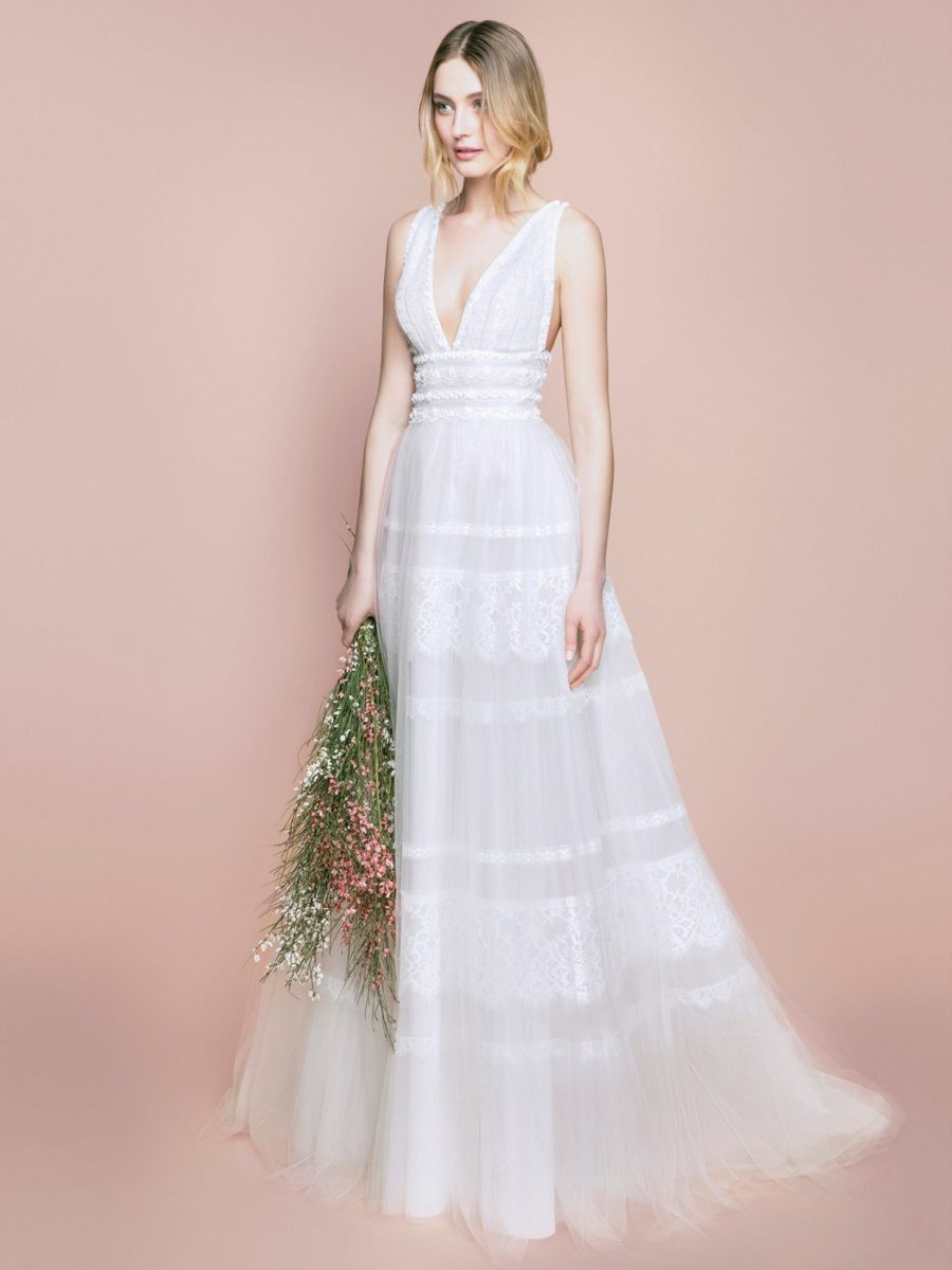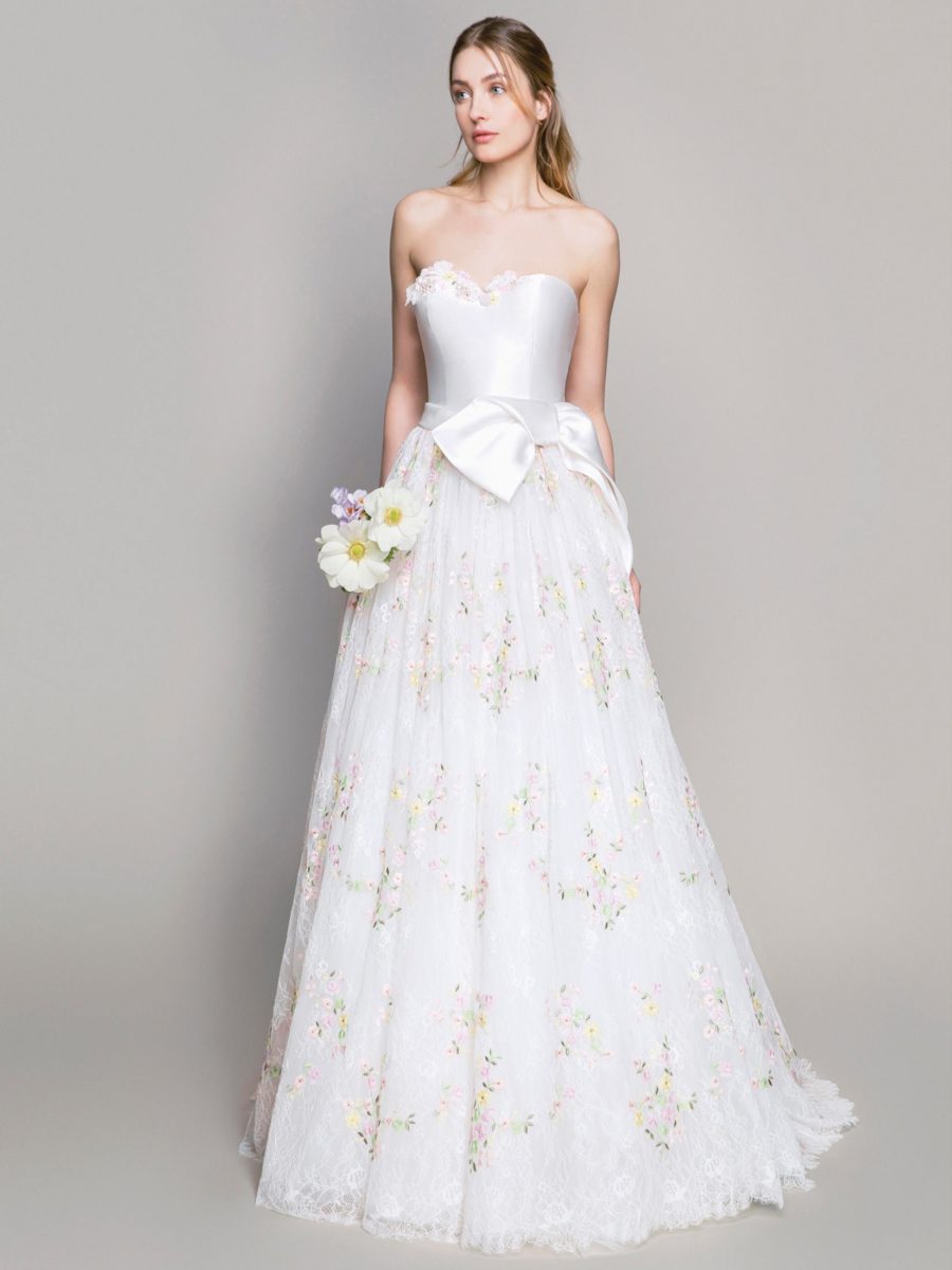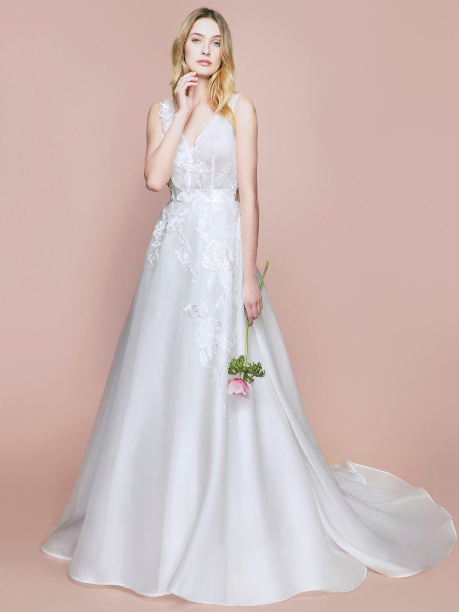 Die klassische Rose ist das Markenzeichen von Blumarine Sposa und sie wurde reichlich in den Designs verarbeitet. Von bedrucktem Tüll bis bestickten Miedern findet man die Rose in fast allen Kleidern wieder.