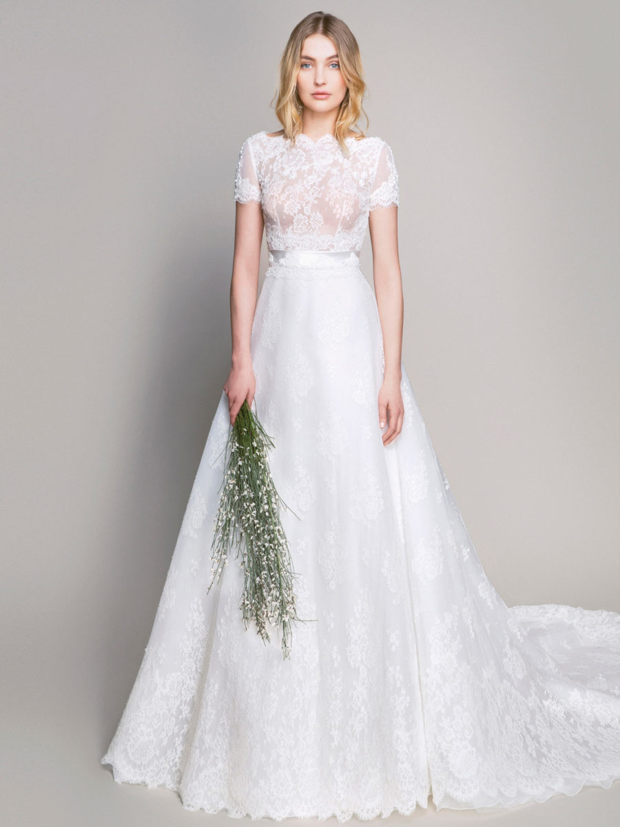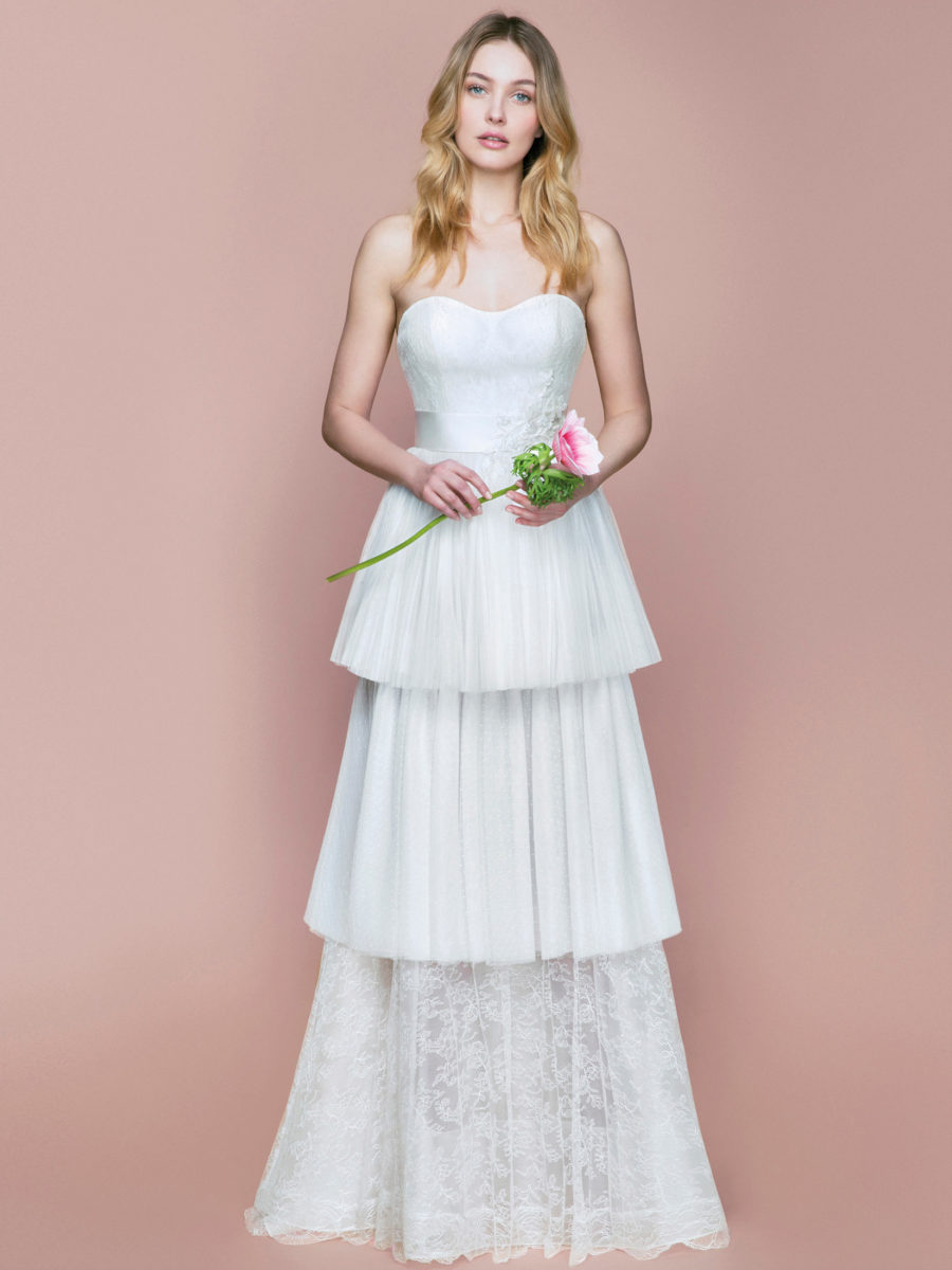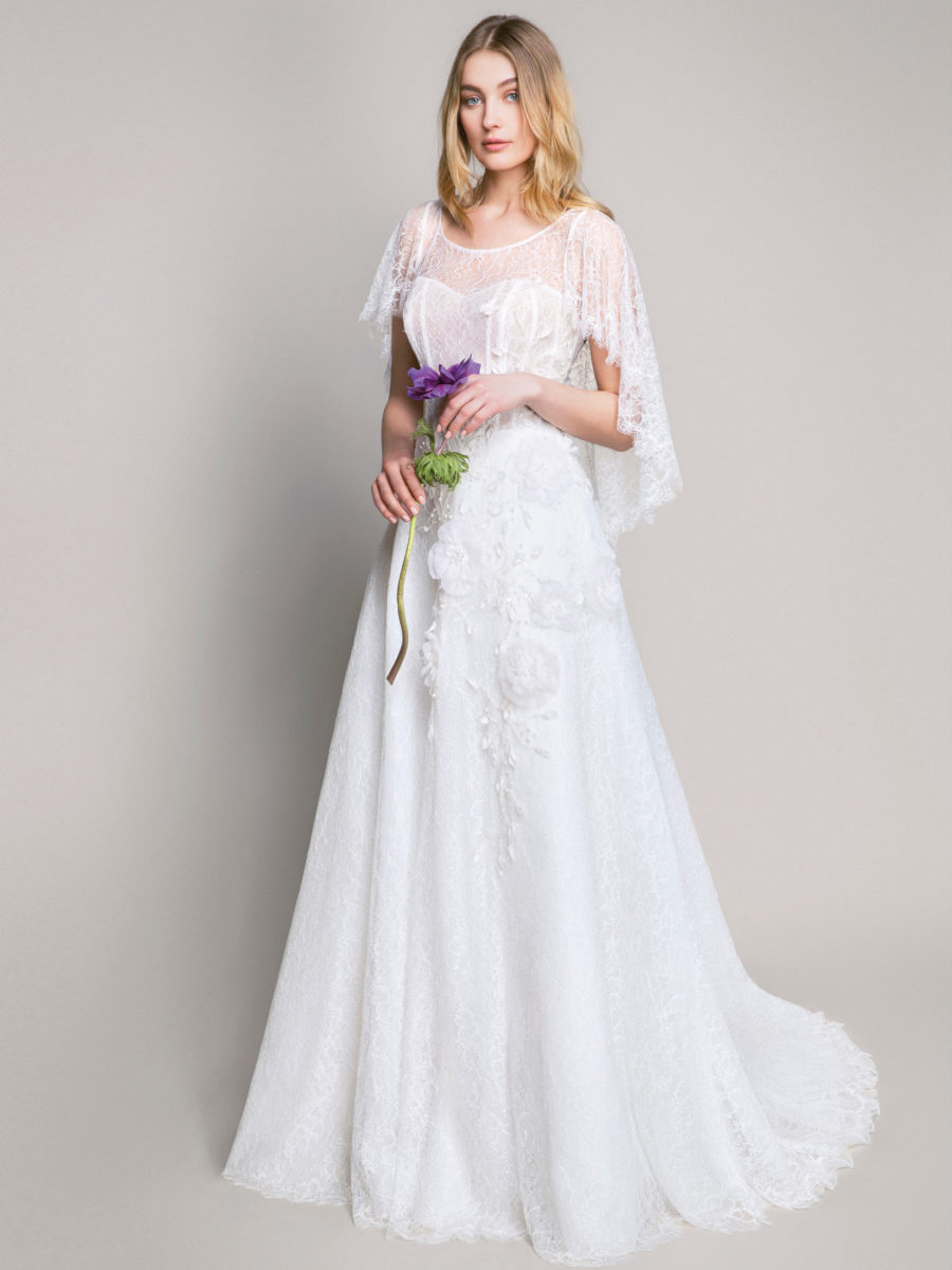 Bevorzugte Materialien sind Chantilly Spitze, Mikado Seide, Duchesse Satin. Die Brautkleider sind sehr detailverliebt gearbeitet und fühlen sich seidig weich auf der Haut an.