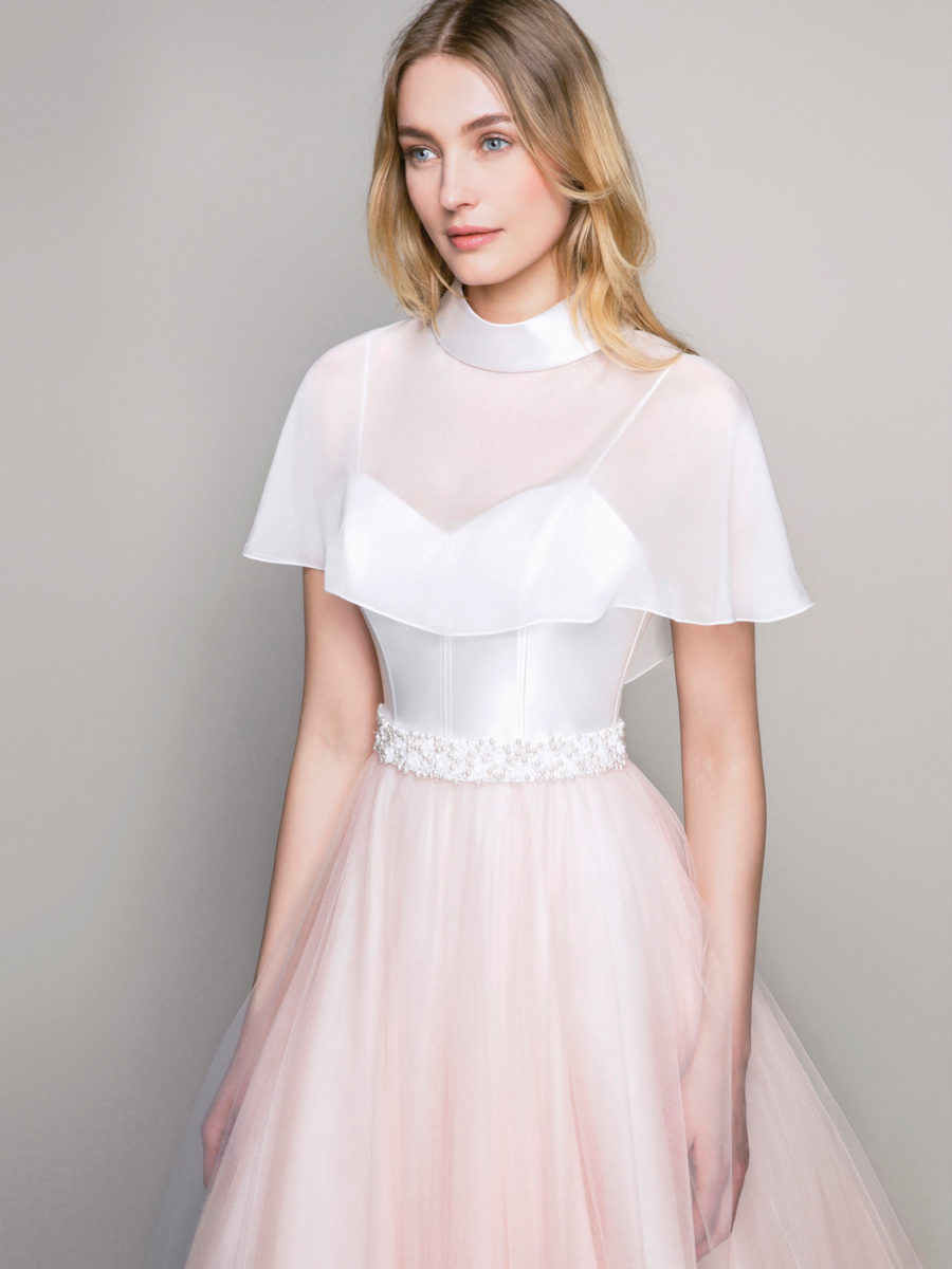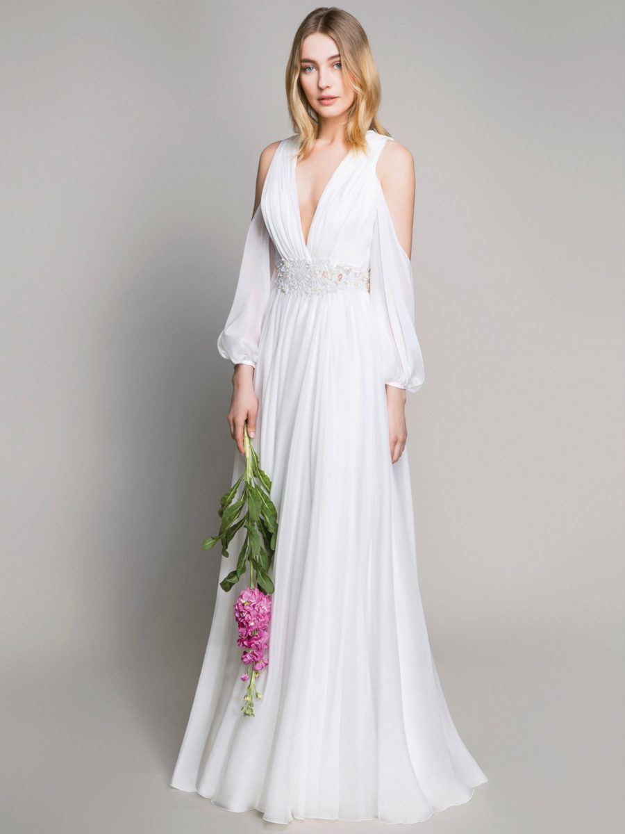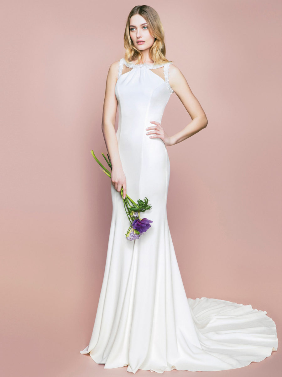 Bevorzugte Materialien sind Chantilly Spitze, Mikado Seide, Duchesse Satin. Die Brautkleider sind sehr detailverliebt gearbeitet und fühlen sich seidig weich auf der Haut an.