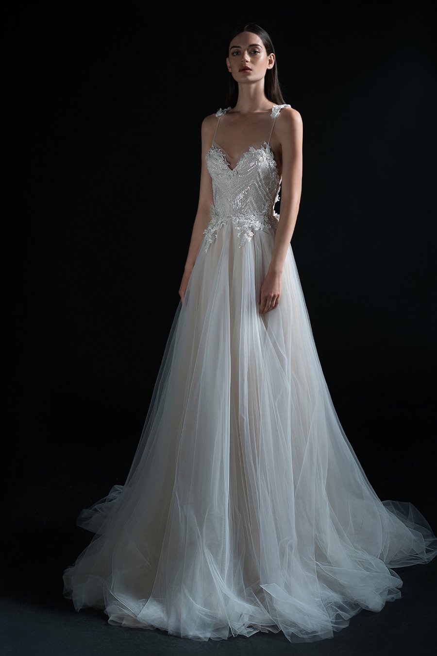 Akzente in Strass und Pailletten sowie Federn und viel Tüll sind 2019 in und wir lieben es! Give us more! Bling Bling. Mehr Brautkleider Trends für 2019 hier.