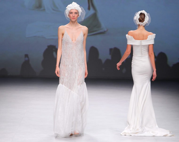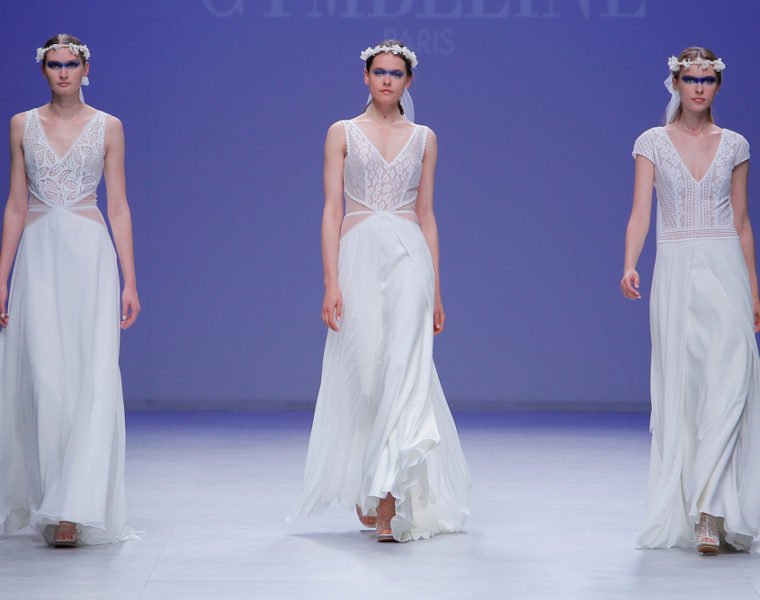 Der erste Blick auf die Cymbeline Brautkollektion 2020 auf der Barcelona Bridal Fashion Week. Das Makeup Styling ist schon mal versprechend gewagt. Spitze ist back. Hosenanzüge und Federn ein prominentes Feature auf…