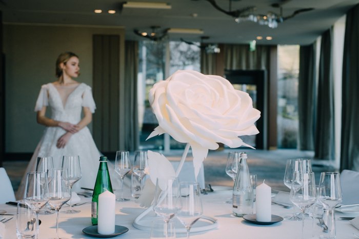 Diese Rosen in Nude Tönen sind nicht aus Papier wie man annehmen würde sondern aus Isolon einem speziellen Kunststoff. Dieses Material ist sehr pflegeleicht denn es ist nicht nur wasserfest sondern brennt auch nicht. (Stattdessen schmilzt es.) Wer noch Ideen für eine schöne und vorallem aussergewöhnliche Hochzeitsdeko für eine Winterhochzeit sucht, der hat mit diesen Riesenblumen einen grossen Vorteil. Denn Schnee und Frost können den hübschen Rosen nichts anhaben – Isolon ist nämlich winterhart. Es verändert seine Haptik und Konsistenz nicht bei Kälte. Wenn es schmutzig wird, kann man es einfach abwaschen.