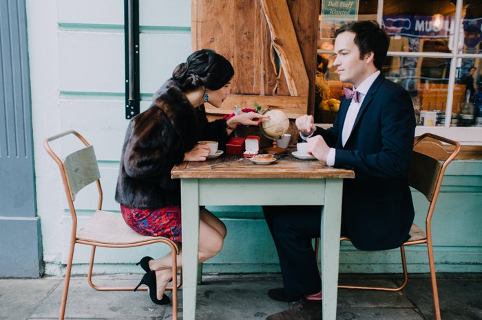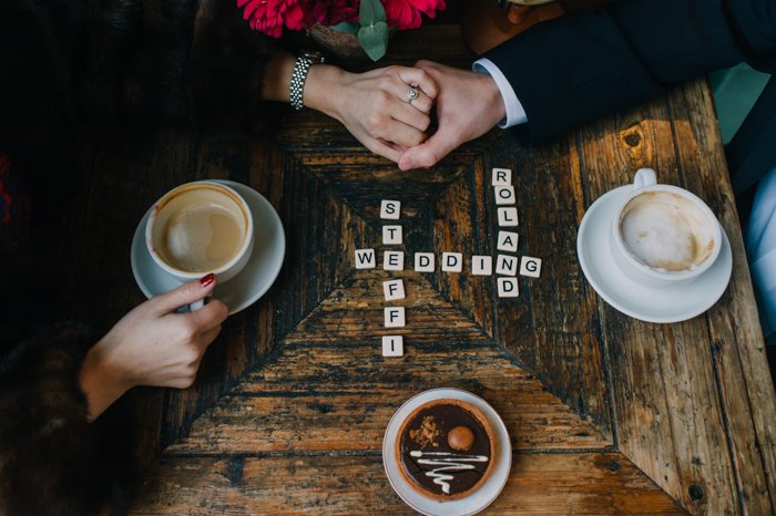 Für Coffee Shop Liebhaber kann man sich in ein fotogenes Café setzen und einen hausgemachten Kuchen geniessen. Mein Paar kam vorbereitet und brachte Scrabble Steine und die Verlobungsringbox mit. Diese Art von Fotos werden gerne als Save the Date Karten versandt oder auf der Wedding Website als Einstiegsbild genutzt.