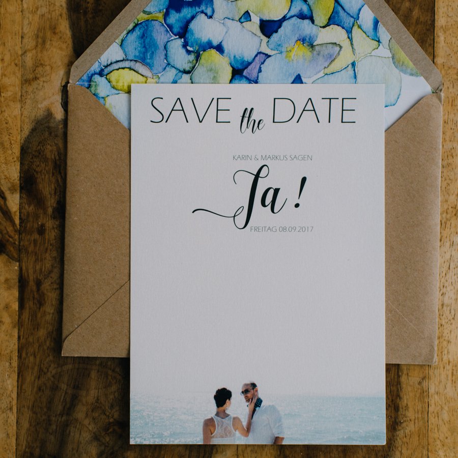 Passende Save-The-Date-Karten könnt ihr versenden, sobald eure „Basis“, euer Hochzeitskonzept, gefunden habt, was bestenfalls etwas ein Jahr vor der Hochzeit und auf euer Konzeot abgestimmt ist. Hübsch wäre noch ein Foto von euch und/oder ein Spruch – der erste grosse Schritt in der Vorbereitungsphase ist gemacht. Super!