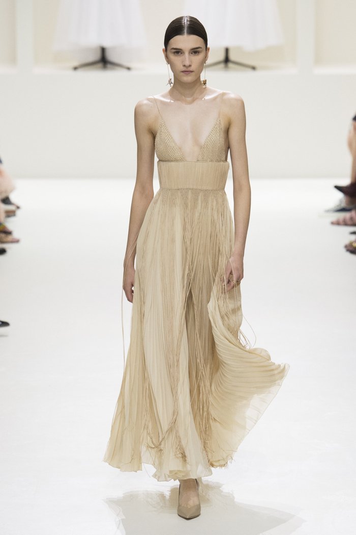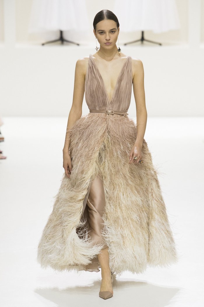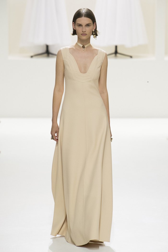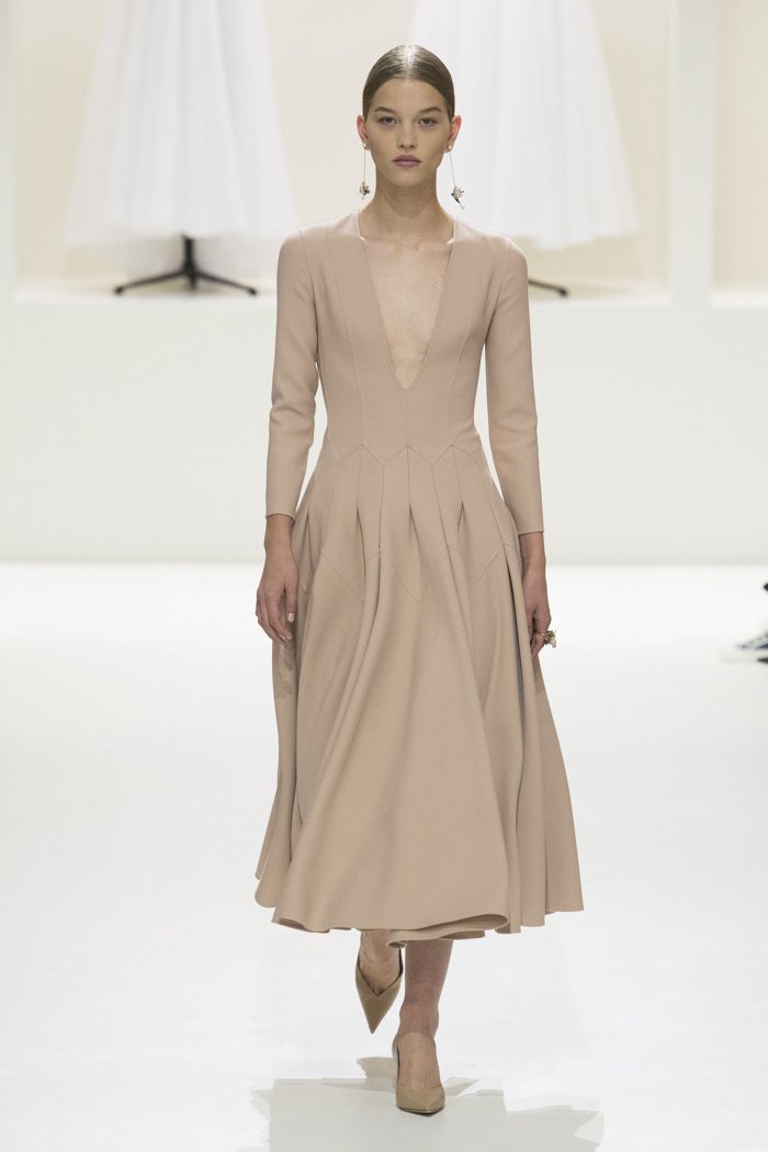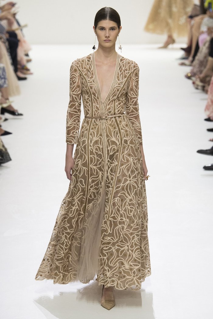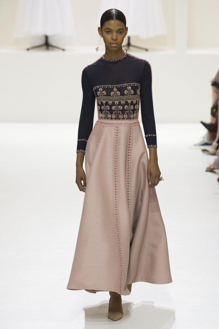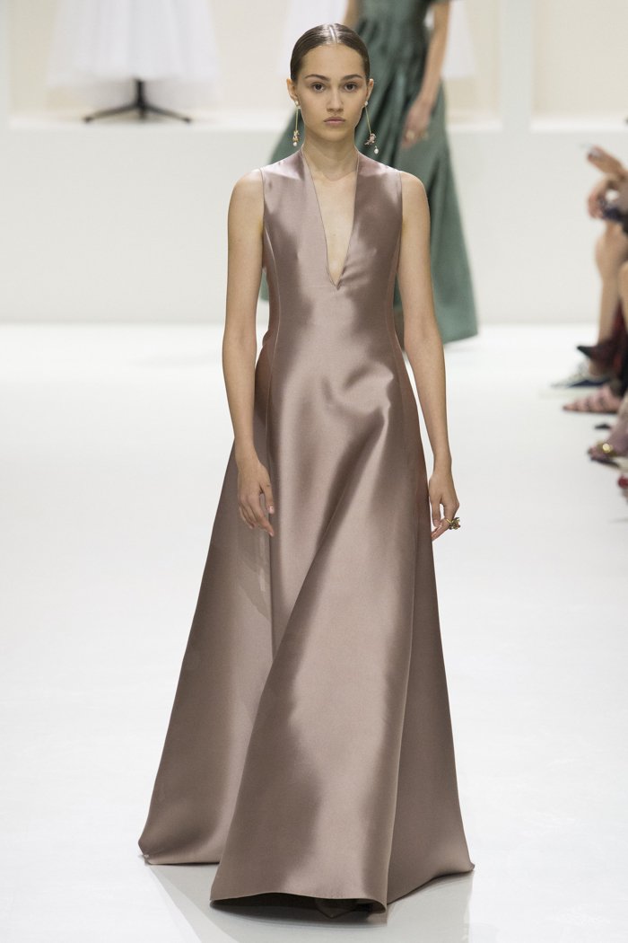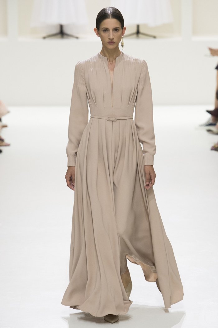 Die Farbpalette für Herbst bei Dior ist nude, rosé, navy und schwarz. Alles sehr simpel und elegant mit luxuriösen Materialien wie Duchesse- und Crepeseide. Viel Aufmerksamkeit wird auch auf aufwändige Handarbeit gelegt: Makramé, bestickte Bordüren u.v.m.