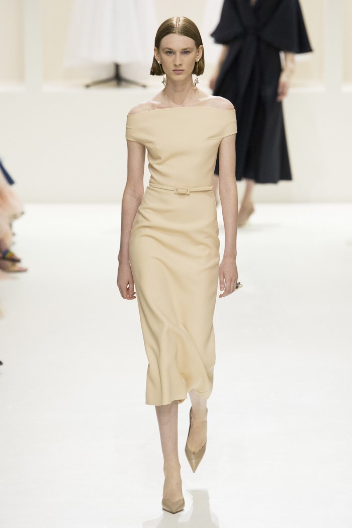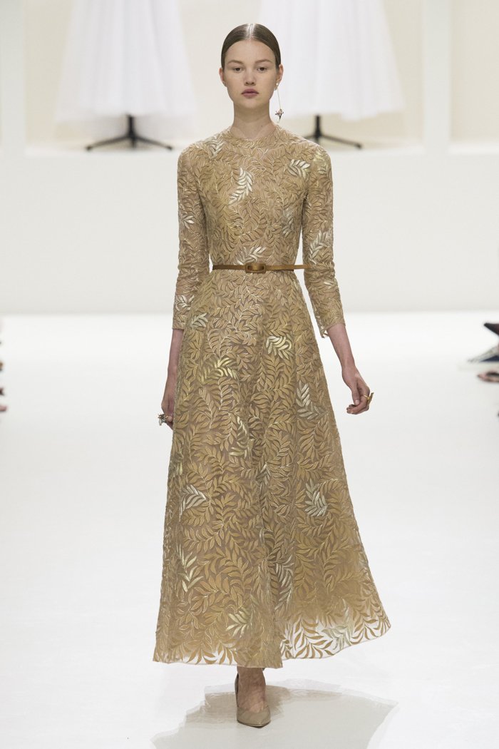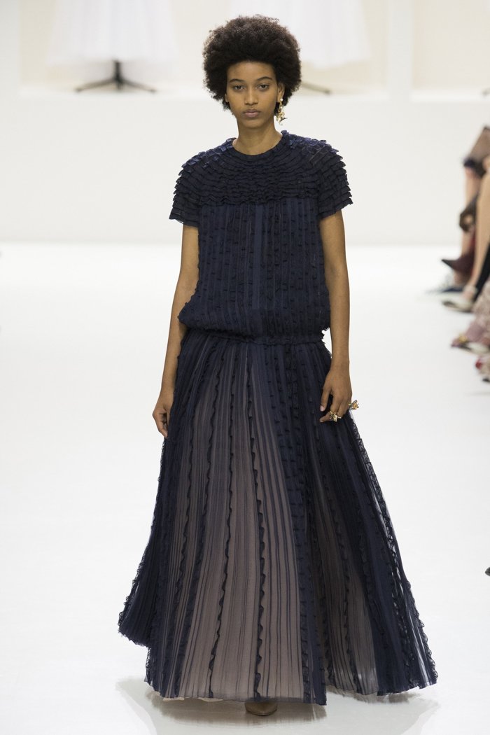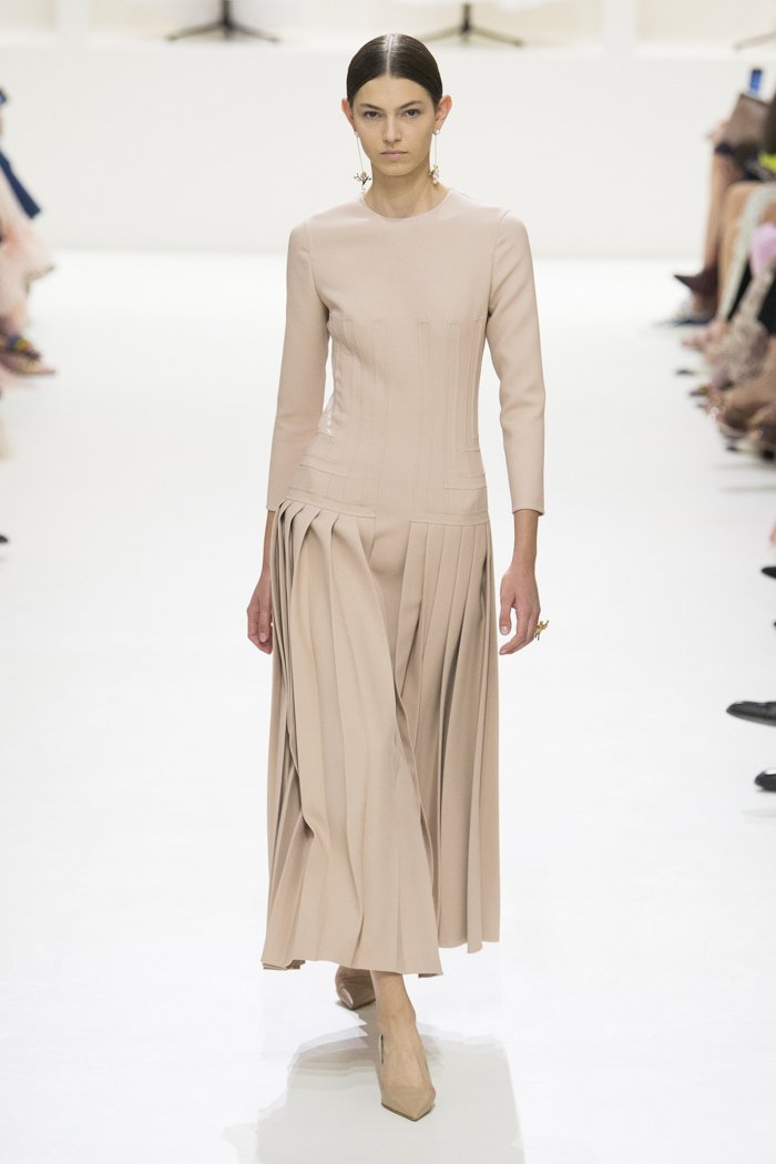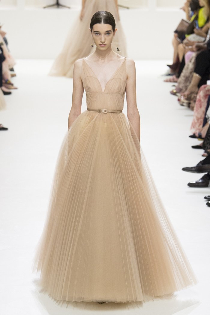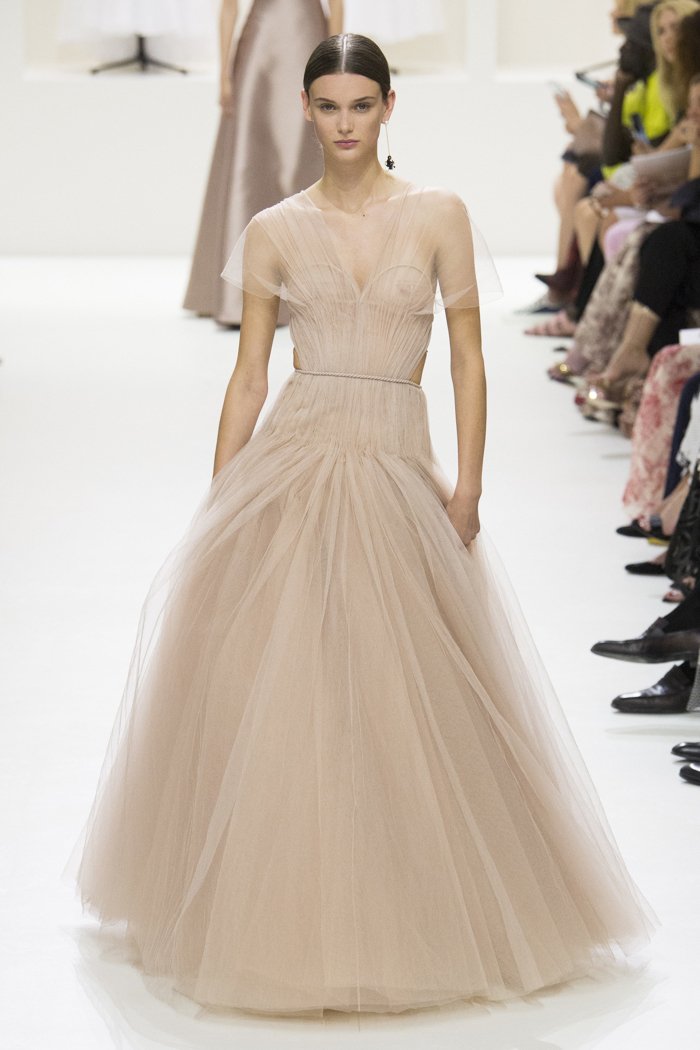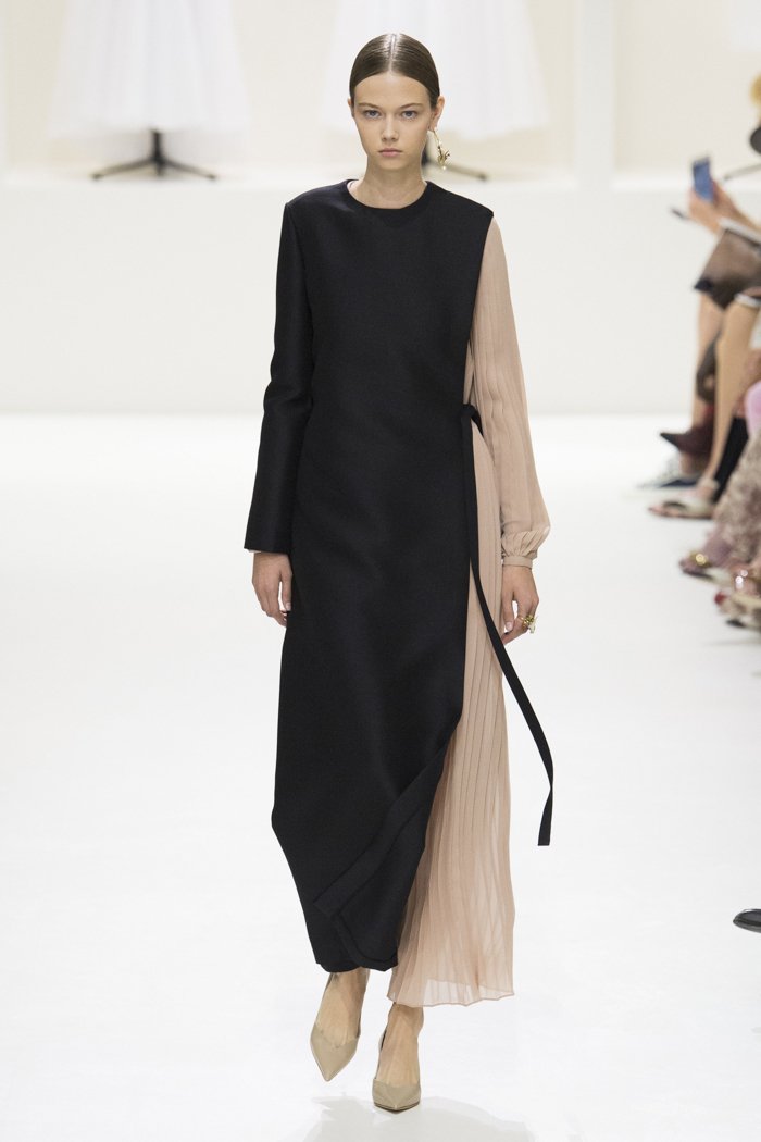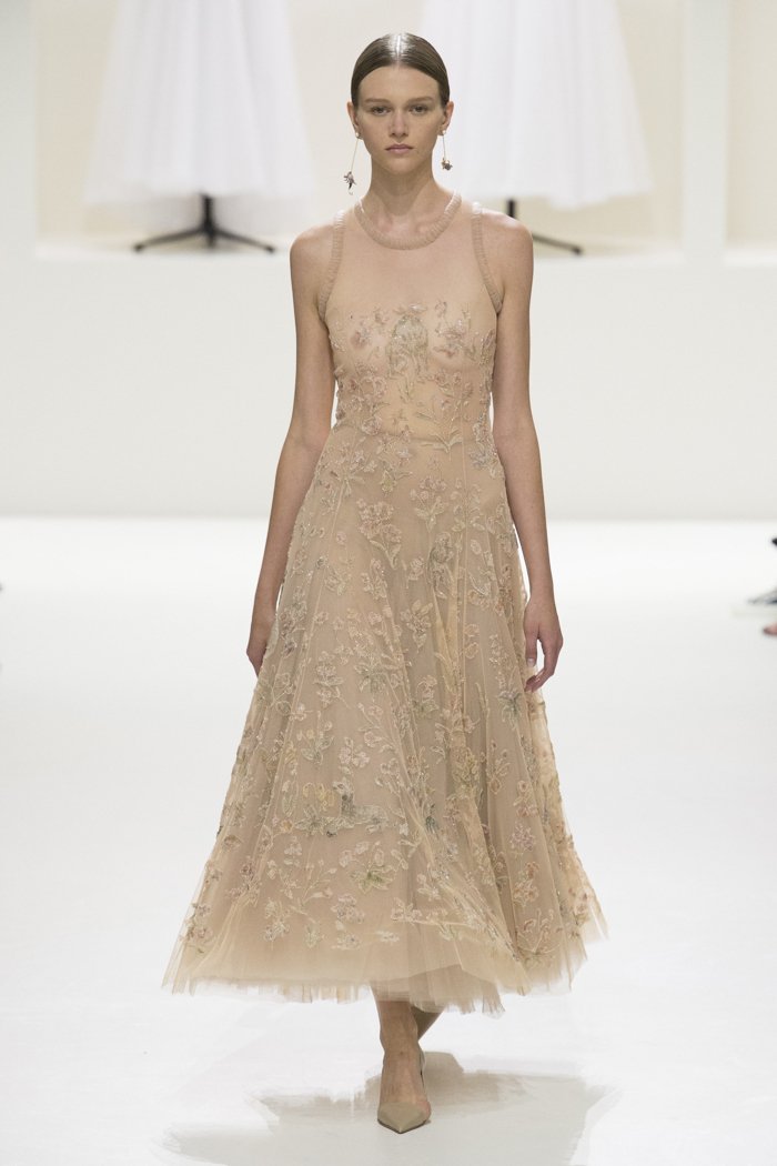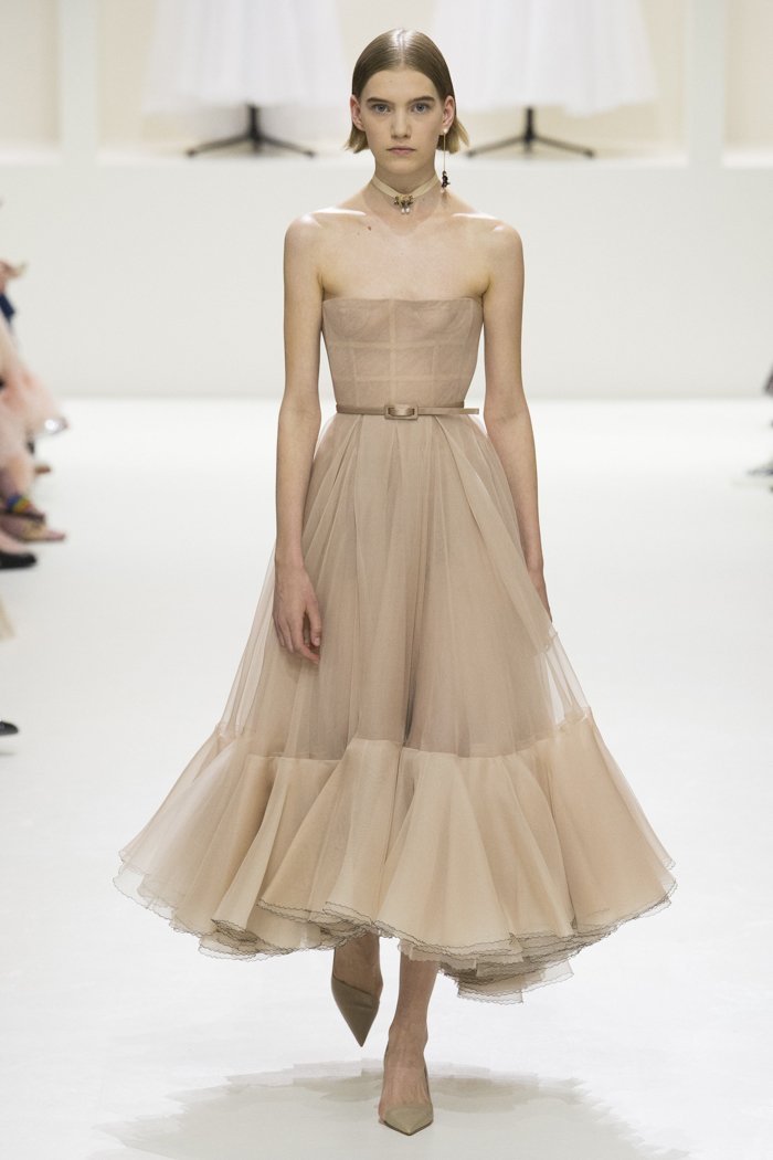 Die Farbpalette für Herbst bei Dior ist nude, rosé, navy und schwarz. Alles sehr simpel und elegant mit luxuriösen Materialien wie Duchesse- und Crepeseide. Viel Aufmerksamkeit wird auch auf aufwändige Handarbeit gelegt: Makramé, bestickte Bordüren u.v.m.