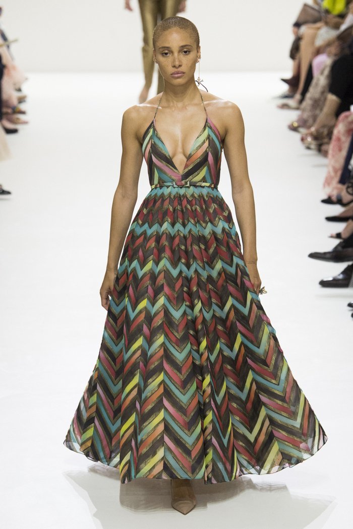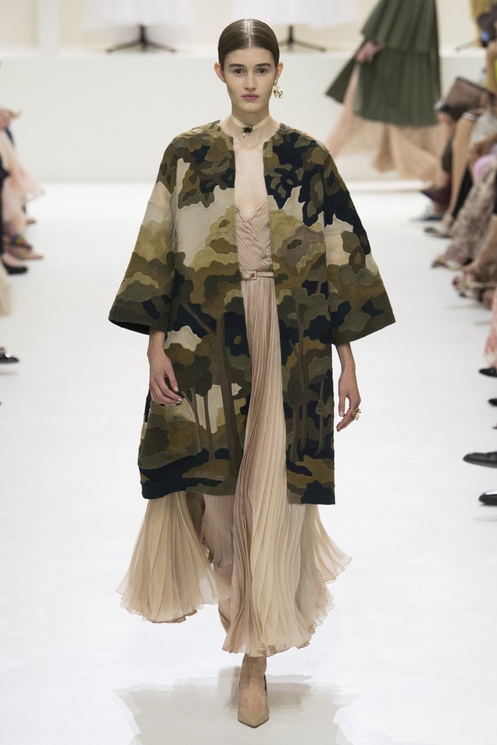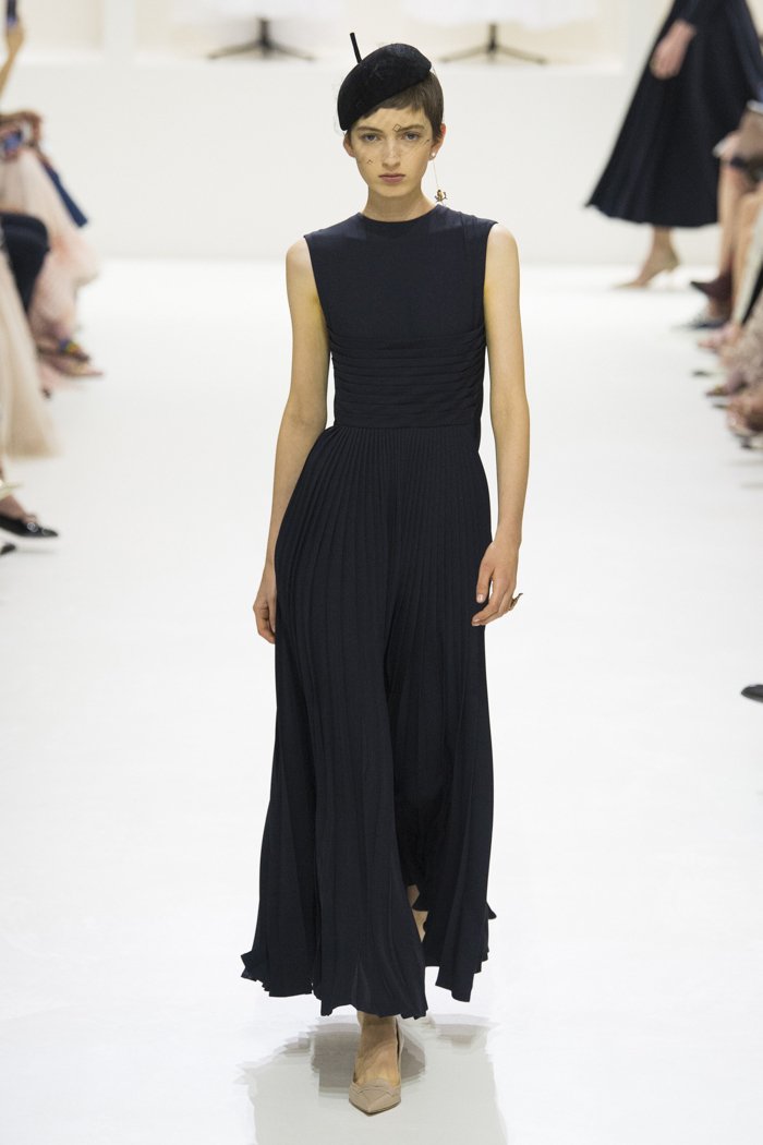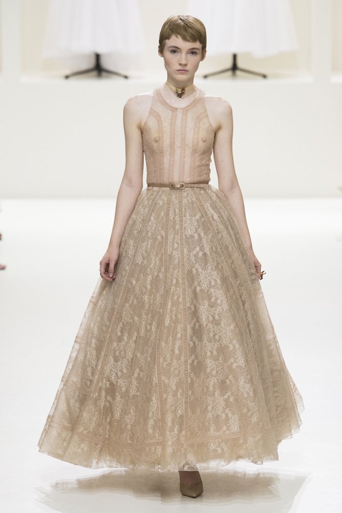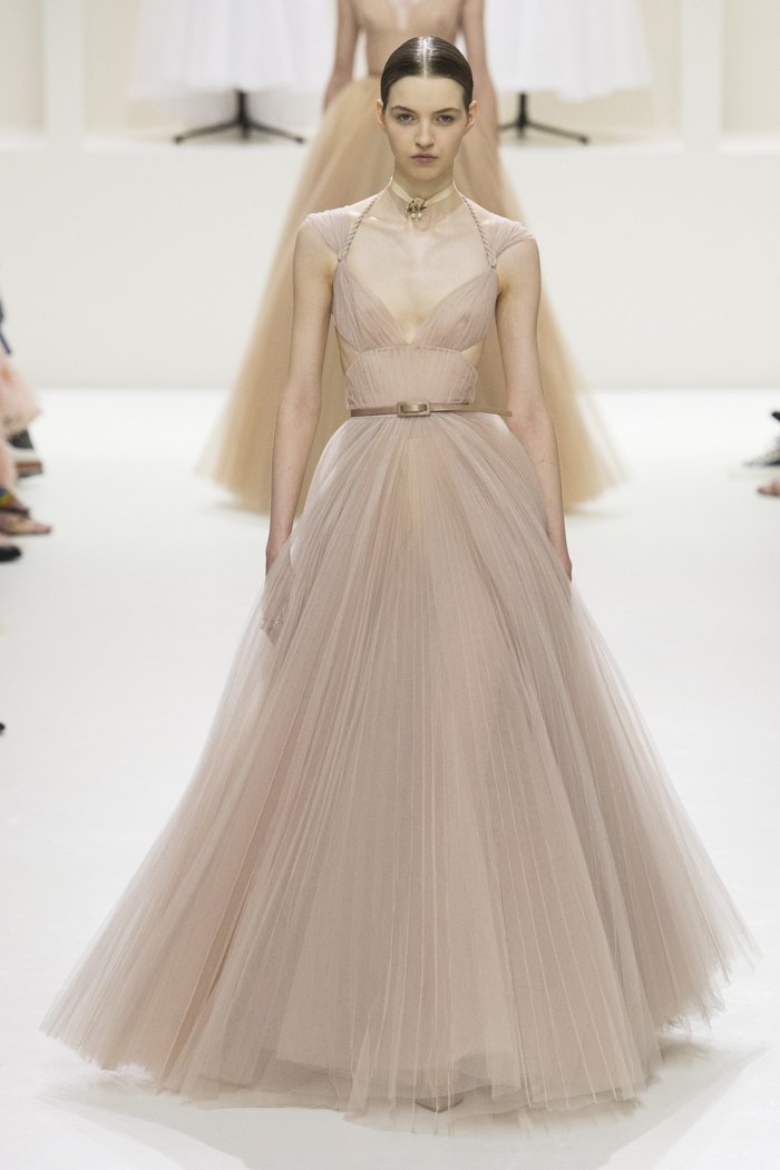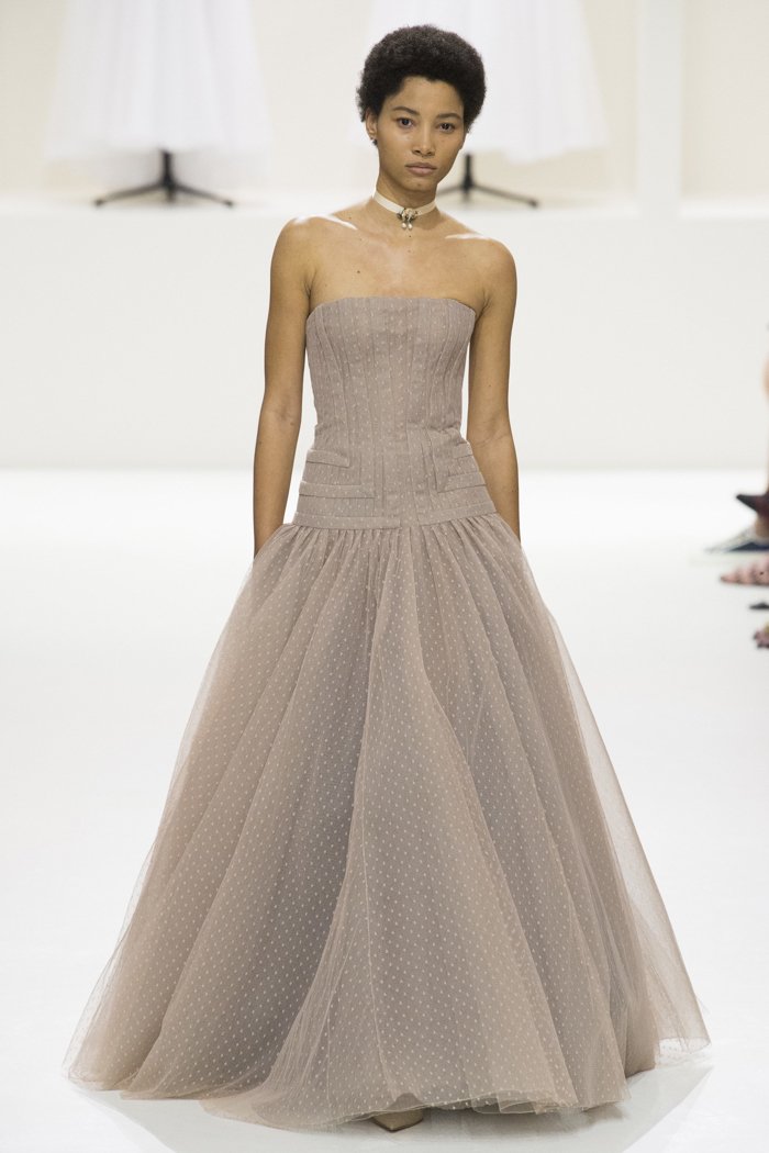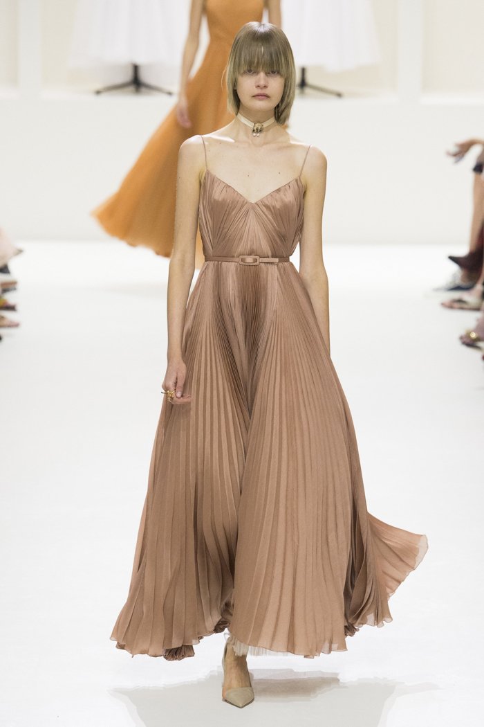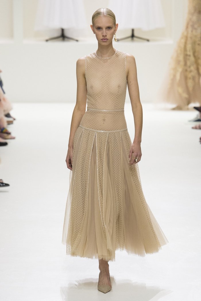 Die Farbpalette für Herbst bei Dior ist nude, rosé, navy und schwarz. Alles sehr simpel und elegant mit luxuriösen Materialien wie Duchesse- und Crepeseide. Viel Aufmerksamkeit wird auch auf aufwändige Handarbeit gelegt: Makramé, bestickte Bordüren u.v.m.