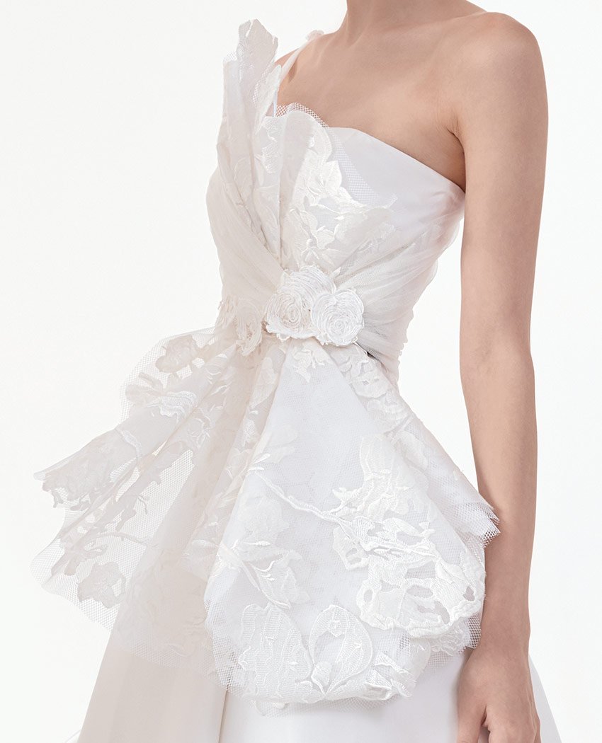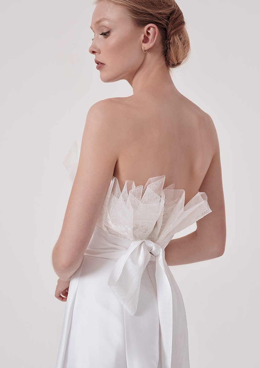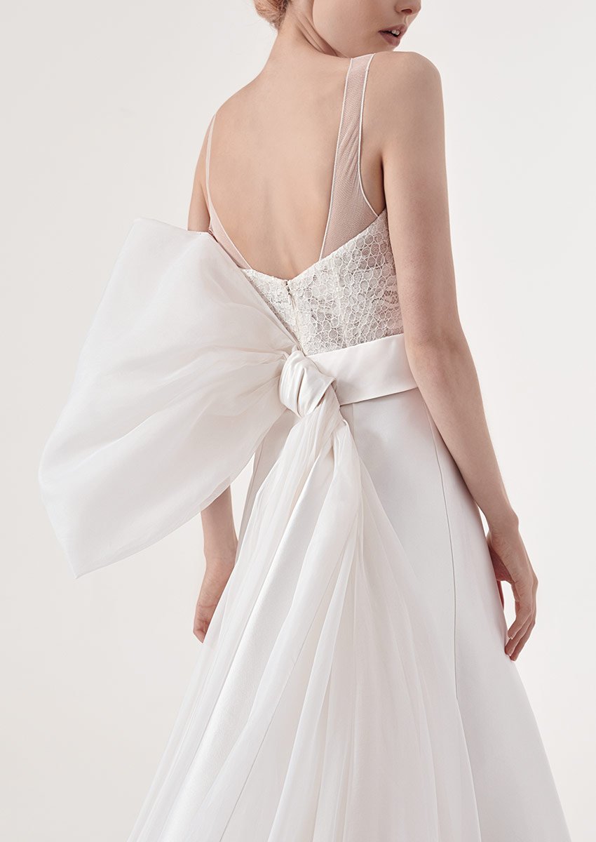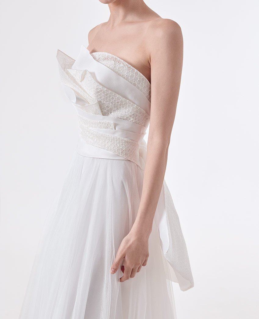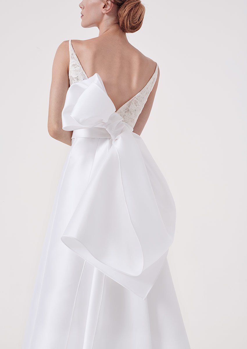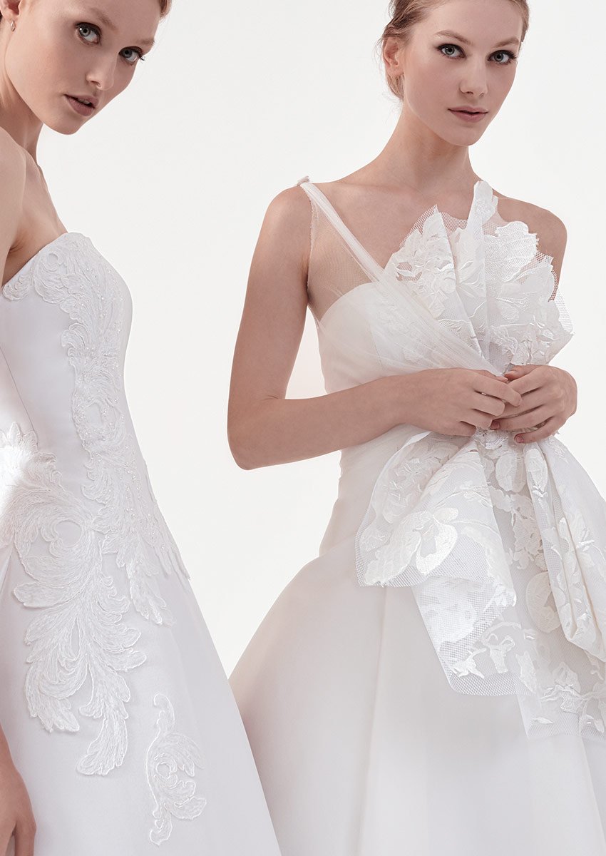 Seiden erster Wahl, die ausschließlich von den besten Herstellern aus Como (dem weltweit renommiertesten Zentrum der Weberei) hergestellt werden, Tüll aus traditionsreichen Mailänder Textilbezirken und handwerkliche Spitze aus dem Norden Frankreichs. Die Stoffe werden nicht nur aus den besten ausgewählt, die die Welt zu bieten hat, sondern sie werden auch sorgfältig vor der Schnittphase kontrolliert.