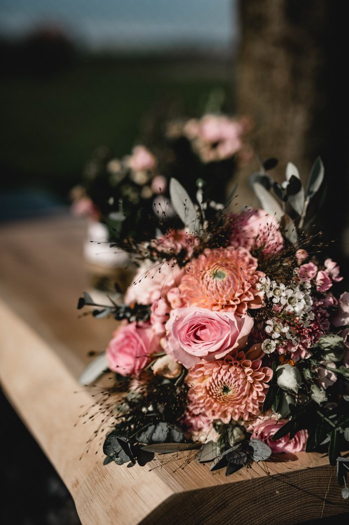 Wir wollten eine Boho Hochzeit. Wir haben auf unserer Hochzeitshomepage darauf hingewiesen, es gab aber keinen offiziellen Dresscode. Schlussendlich waren aber auch die meisten Gäste dementsprechend gekleidet. Die Farben waren klar in Pastelltönen/Erdtönen gehalten. Die Dekoration habe ich grösstenteils selbst gebastelt, entworfen und zusammengestellt. Es war uns wichtig einen „roten Faden“ zu haben und alles aufeinander abzustimmen.