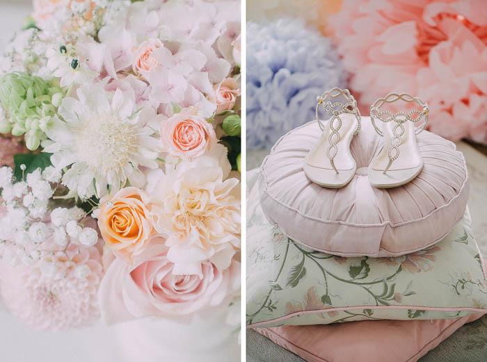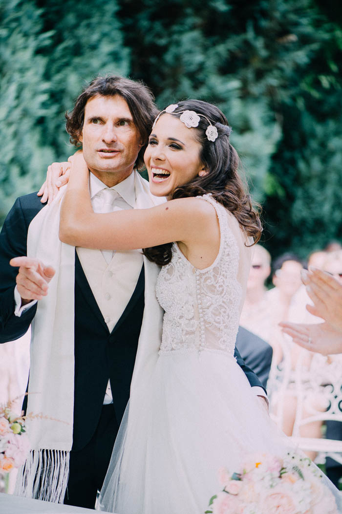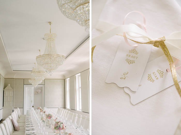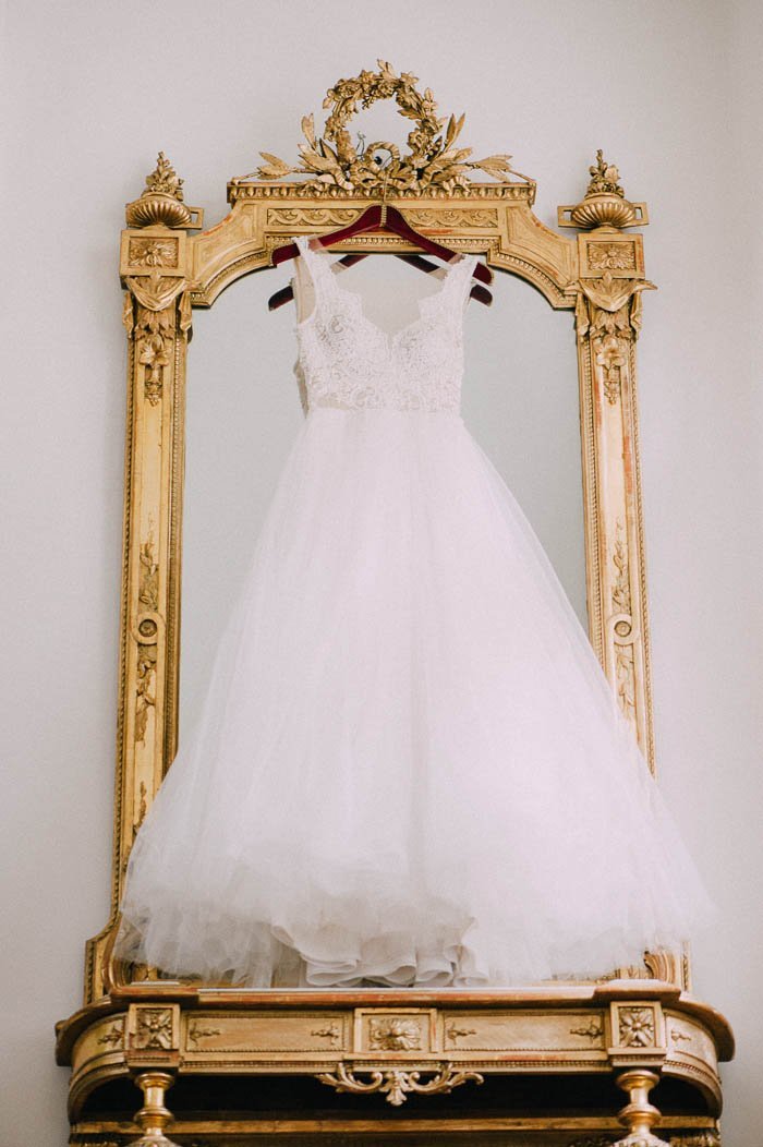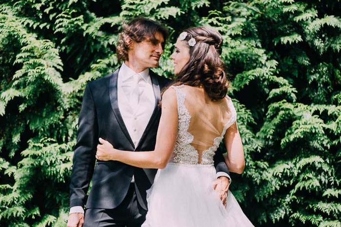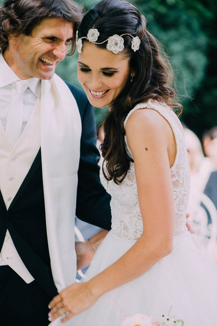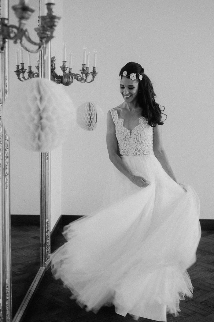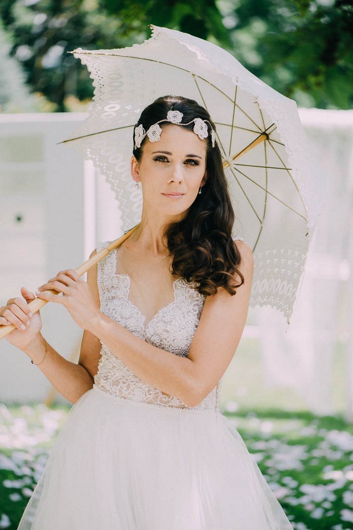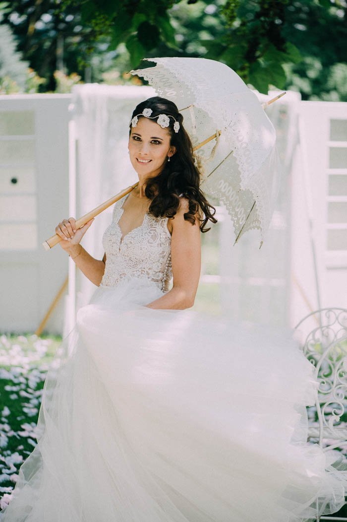 Das Traumkleid stammt von der brasilianischen Designerin Solaine Piccoli und ist aus zartem Tüll und wertvollen Perlenstickereien. Auch der Kopfschmuck ist Handarbeit und kommt aus dem Atelier von Niely Hoetsch in Wien.