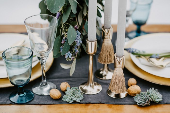 Du musst nicht verzweifeln, wenn du nicht ein riesiges Budget für Hochzeitsdeko ausgeben kannst. Auch mit kleinem Budget kann man viel erreichen, sofern man es richtig einsetzt. Für dieses Shooting haben Andrea und Katrin Accessoires im Wert von CHF 200 gekauft und sonst verwendet, was sie schon zu Hause hatten. Das dezente Farbschema in Gold und gedämpften Blau lässt alles sehr elegant und edel wirken. Deshalb ist es auch wichtig, vorallem bei niedrigem Budget einen Profi zu buchen. Der macht einfach mehr aus deinem Geld. Also nicht aus dem Geld, das wird natürlich weniger aber du weisst was ich meine ;) )