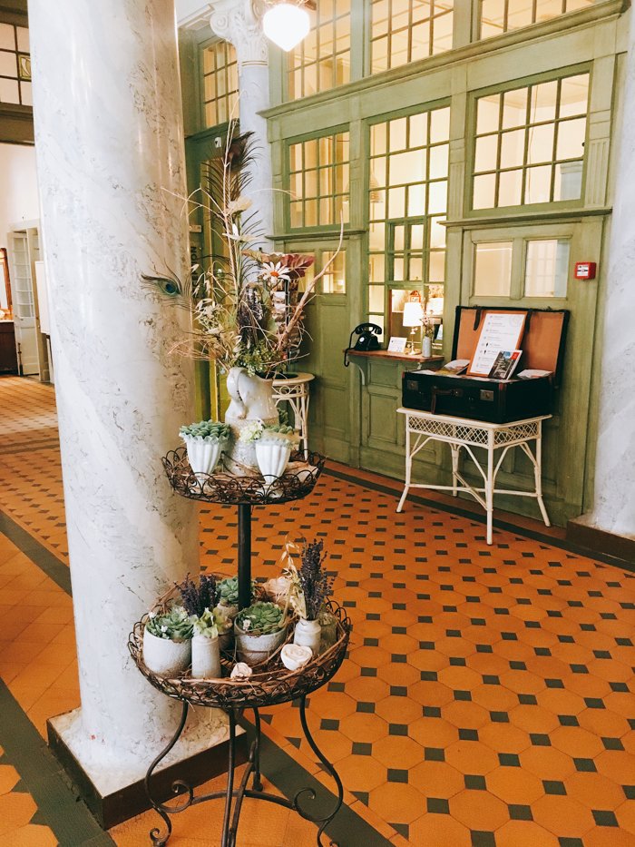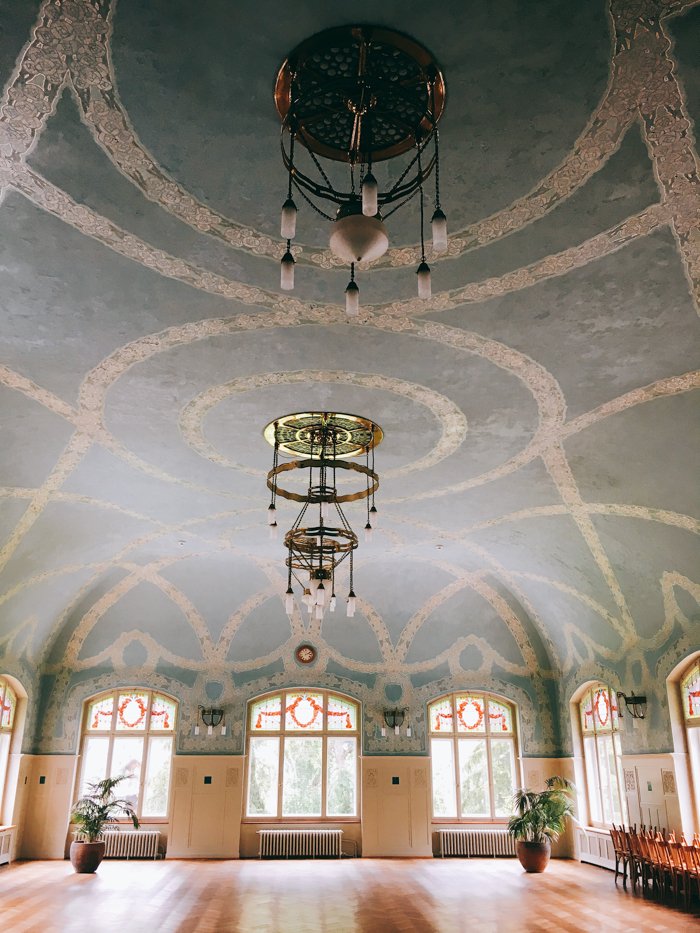 Sobald man durch die Türe geht, lässt einen das prachtvolle Jugendstil Intérieur staunen. Die Farben sind in olive-eukalyptusgrün gehalten und ein Traum für jede Hochzeitspalette in Pfirsich und Rosétönen. Das Gebäude ist in mehreren Etappen liebevoll restauriert worden und erstrahlt jetzt wieder in vollem Glanz.