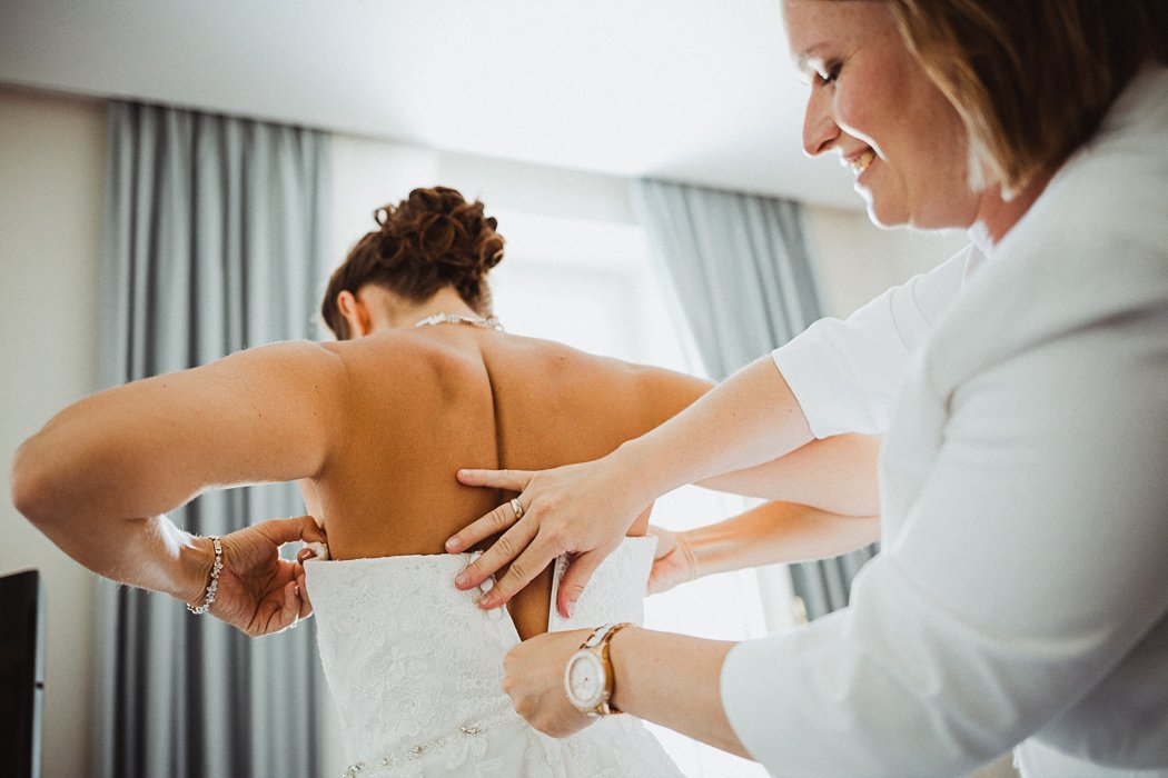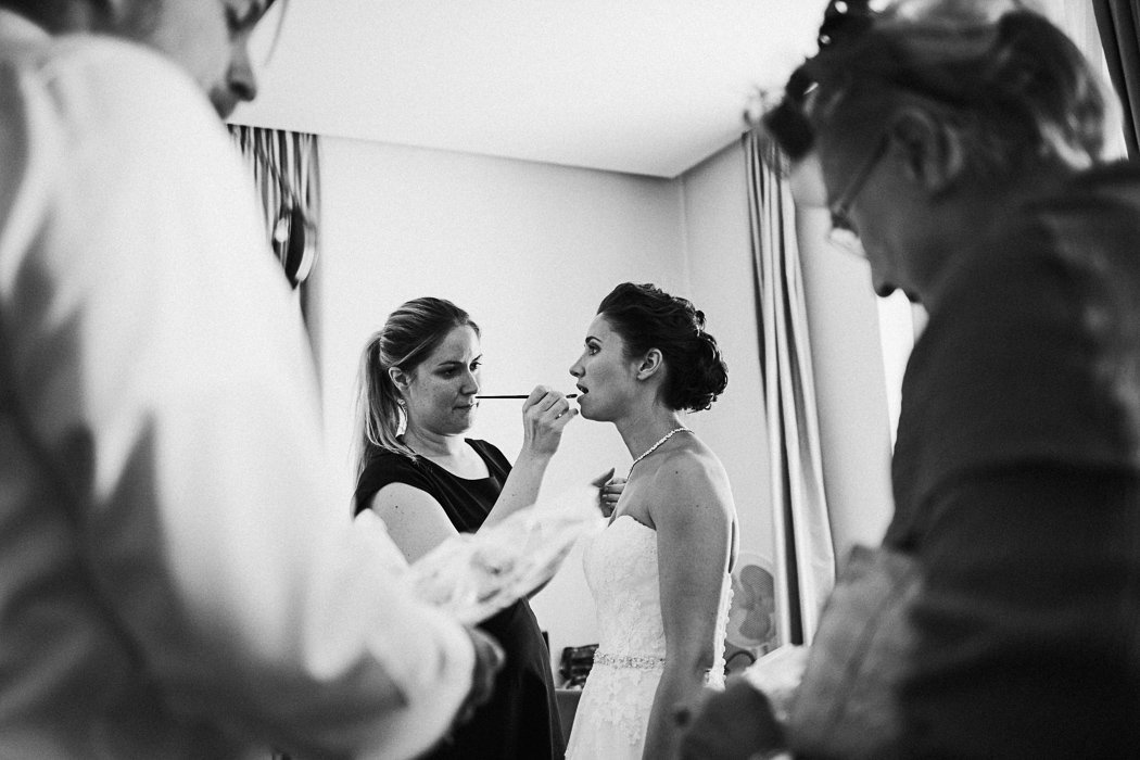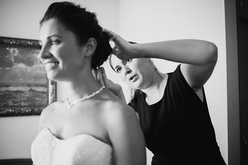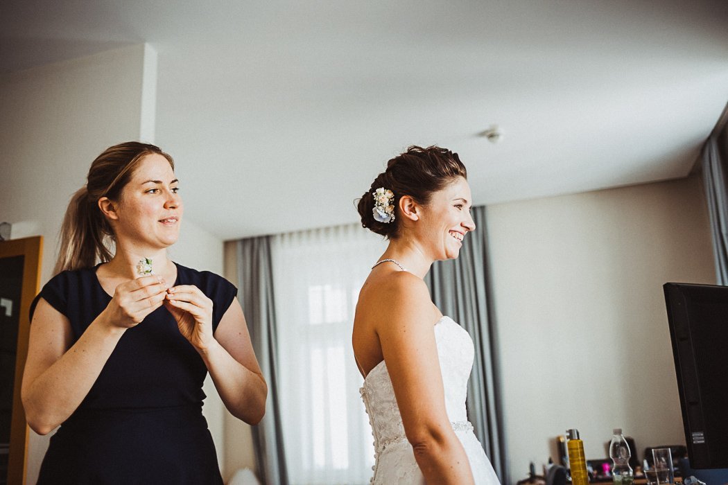 … und noch ein Blick zurĂĽck zu den Vorbereitungen der Braut. Schön langsam sitzt die Frisur und der letzte Schliff wird vollbracht. Jetzt kann es sich nur um Stunden – ups Verzeihung – Minuten handeln.