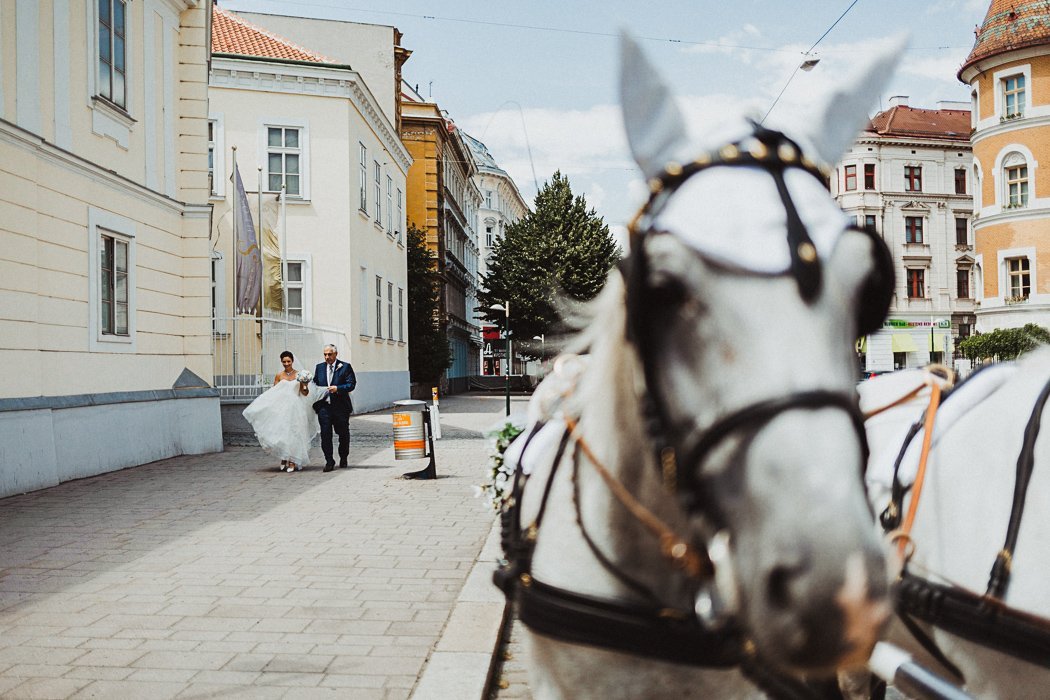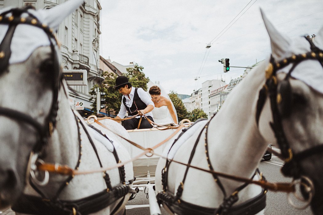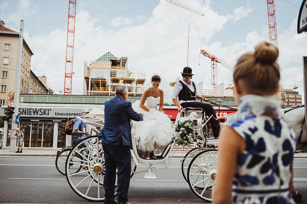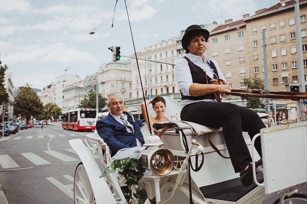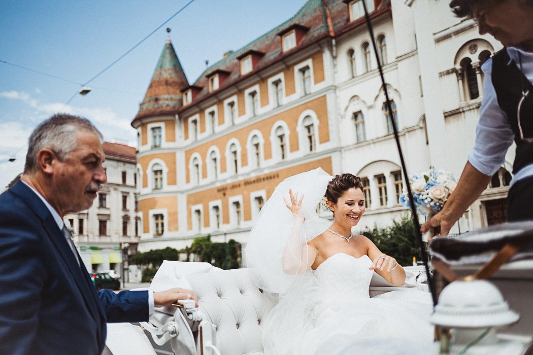 Das Brautpaar entschied sich für eine Location direkt im 3. Bezirk – das bezaubernde Parkschlössl Wien. Es ist ein denkmalgeschützes Palais mit einer großzügig angelegten Parkanlage im Herzen Wien’s was sich hervorragend für eine Traumhochzeit anbietet. Nach dem getting ready ging es von dort aus mit der Kutsche weiter in die sehr nahe gelegene Rochuskirche zur kirchlichen Trauung. Anschließend wurden noch ein paar runden mit der Kutsche gedreht, die beiden hatten sichtlich Spass und bekamen immer wieder freundliche Gratulationen zugerufen.
