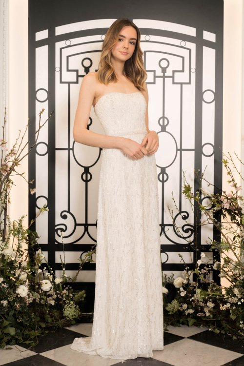 Auch bei Jenny Peckham findet man die für Brautmode 2020 obligatorischen Federn. Der Minirock ist für mich noch das aussergewöhnlichste und originellste Stück – vorallem kombiniert mit den sexy Stilettos und Federnbänder.