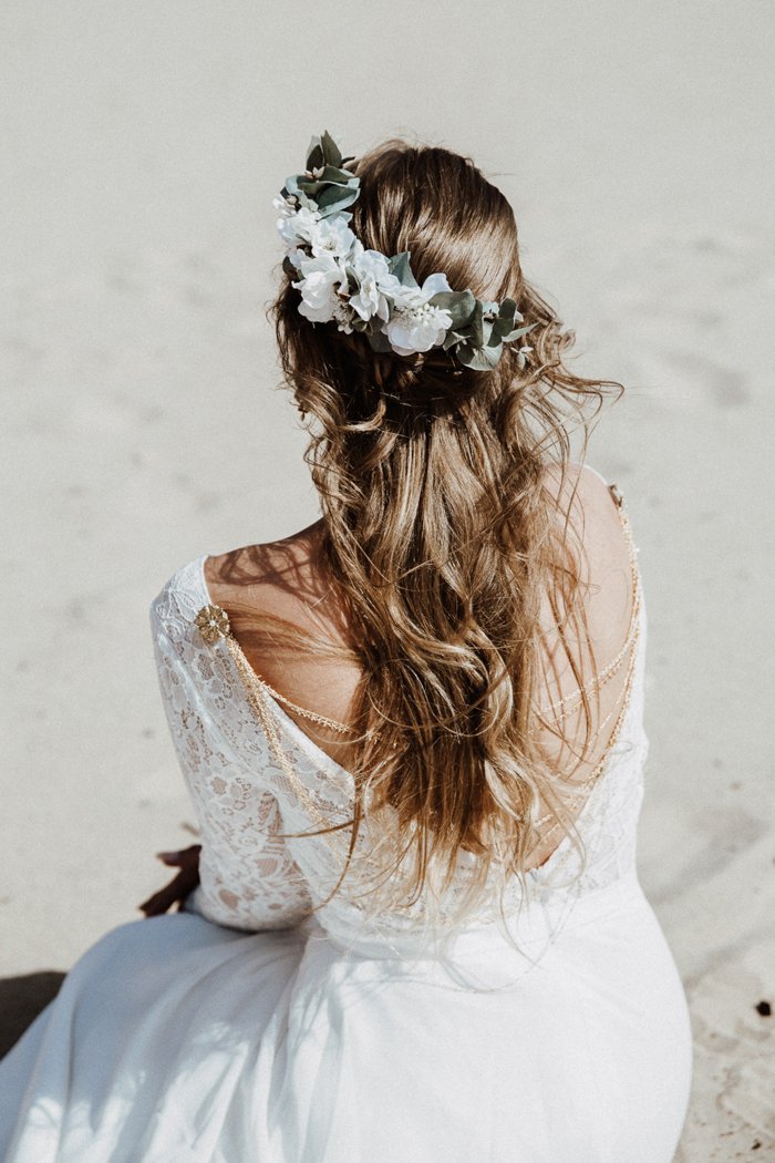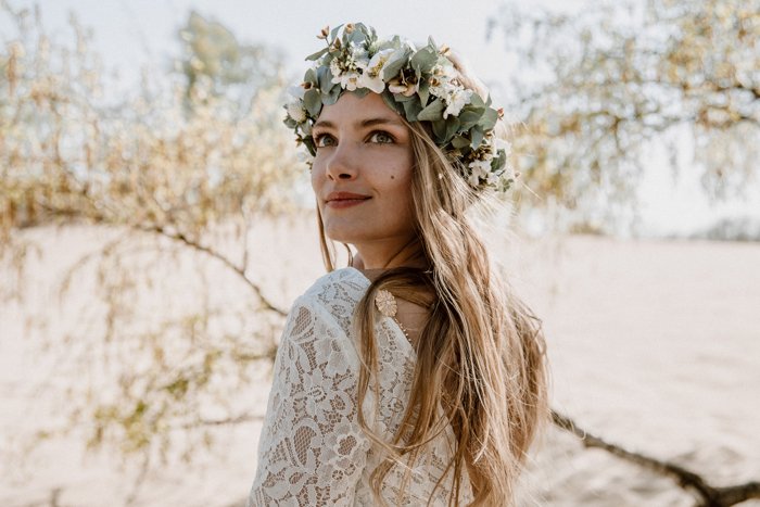 Ein beträchtlicher Vorteil der künstlichen Kränze gegenüber frischen, ist die lange Haltbarkeit. Bei dem Shooting in den Borberger-Dünen wehte ein sehr starker Wind. Trotzdem sahen die Kränze von Anfang bis zum Schluss schön aus und hatten einen perfekten Halt. Auch einen Hochzeitstag in großer Hitze macht den künstlichen Kränzen nichts aus.