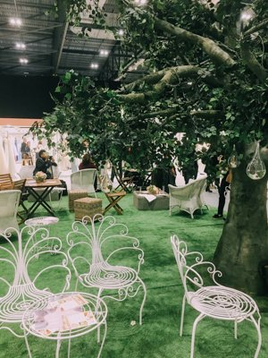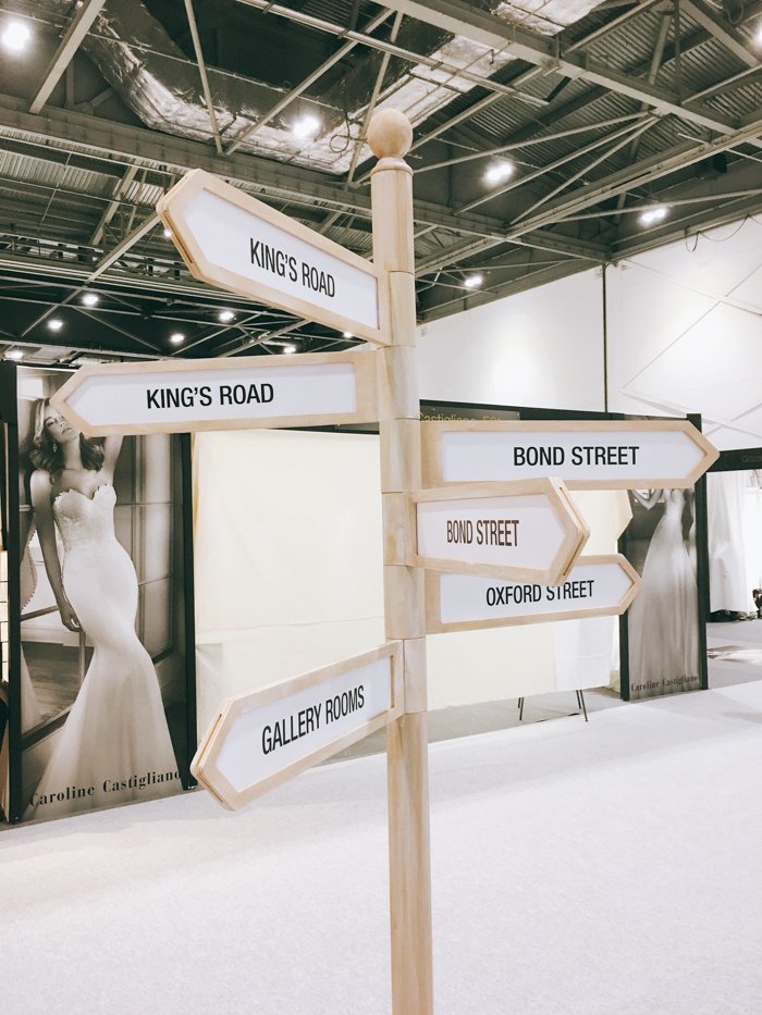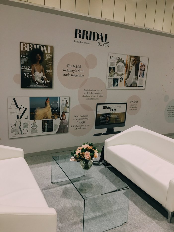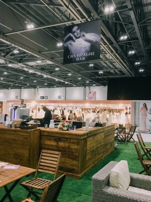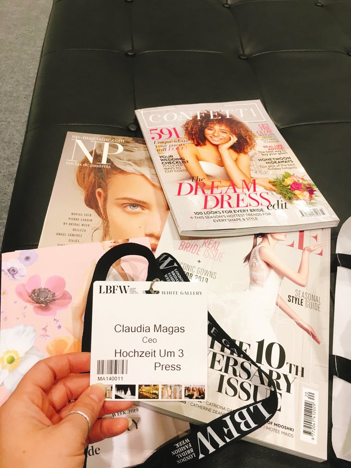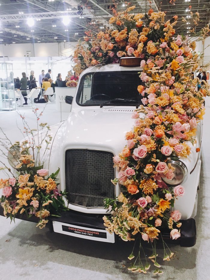 Am Eingang steht ein London Cab in stylishem Wedding White gefärbt und einer fabulösen Blumendeko. Das ist aber auch die einzige wirklich herausragende Deko, die ich entdecken kann. Leider ist die Halle etwas langweilig im Grossen und Ganzen ist sie eher zweckmässig dekoriert. Kein Vergleich zu Barcelona Bridal Fashion Week 2018.