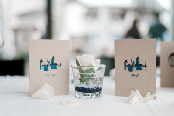 Adasa & Ping überraschten ihre Gäste mit personalisierten Menükarten in Spanisch und Chinesisch. Als Hochzeitslogo verwendeten sie Karikaturen ihrer Gesichter. Diese Idee fand ich besonders originell. Nicht immer das mittlerweile gängige Monogramm.