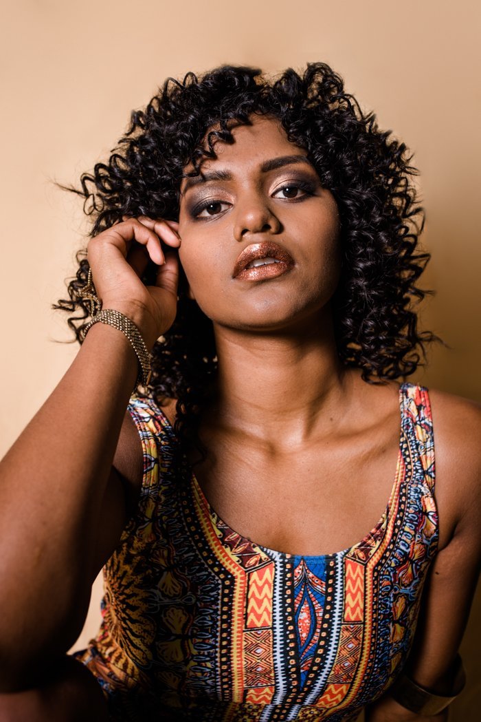 Für das vorgegebene Thema Miami Beach Time bereitete sich Nadja mit ihrem Model Sushma Monate lang vor. Inspiriert von Ethno Beauty hat Nadja auch den aktuellen Trend metallic lips aufgegriffen und perfekt in Bronze ausgeführt. Ganz besonders ist sie aber stolz auf die aufwändige Frisur. Denn das Locken drehen hat ganze drei Stunden gedauert!