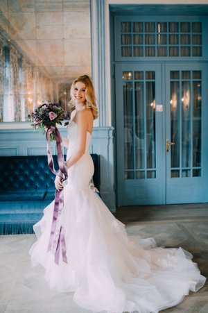 Bei einem klassischen Mermaid Brautkleid fängt der Rock meistens unter dem Knie an. Für einen wahrlich königlichen Einzug und vorallem für kirchliche Trauungen geeignet, kommt der Kathedralenschleier in Frage.