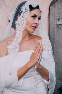 Falls du dich für ein Brautkleid mit einem risqué Rückenauschnitt entschieden hast UND du in der Kirche heiraten möchtest dann ist ein Schulterschleier passend.