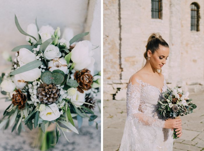 Mit Tannenzapfen kannst du deinen Brautstrauss winterlich aussehen lassen. Weiss-braun gemischt mit schönen Grüntönen vervollständigt den winter wedding vibe. Hübsch, oder?