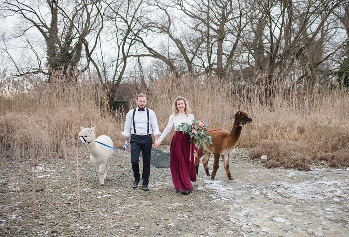 Alpakas, die Teddys unter den Kamelen, liegen voll im Trend. Mit ihren wunderschönen Augen und Wimpern ziehen sie jeden in den Bann. Verständlich also, dass immer mehr Bohobräute die süssen Tiere auf ihrer Hochzeit einbinden möchten. Normalerweise werden die flauschigen Tiere zu Therapiezwecken für kleine und grosse Patienten eingesetzt. Aber wie bei den meisten Trends aus den USA, schauen sich jetzt auch heimische Bräute nach dem gewissen Etwas für ihren grossen Tag um. Et voilà so kommt es, dass Lamas und Alpakas die Ehrengäste auf Hochzeiten sind. Ob als Ringträger oder nur für das Fotoshooting hängt vom Brautpaar und ein bisschen von den Tieren ab.