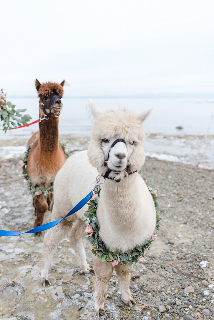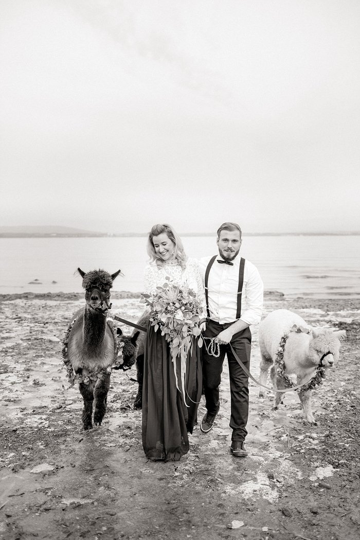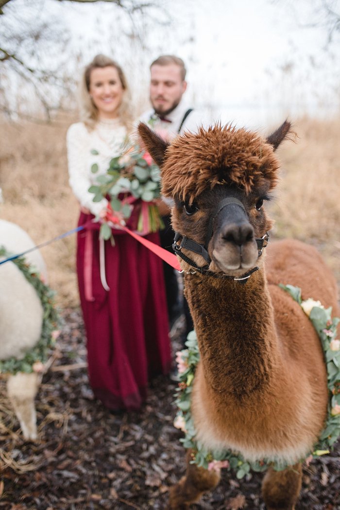 Man kann nicht verleugnen, dass Alpakas und Lamas hervorragend zum Boho Wedding Look passen. Hippie-chic und dabei naturverbunden, unkompliziert und lässig zugleich kann man so seine Hochzeitsfeier aufpeppen. Wer noch eins draufsetzen will, der verpasst den ohnehin schon hübschen Tieren einen schönen Blumenkranz. Finger weg von Zylinder und Schleier für die Tiere. Das ganze soll ja nicht komplett zum Zirkus werden.